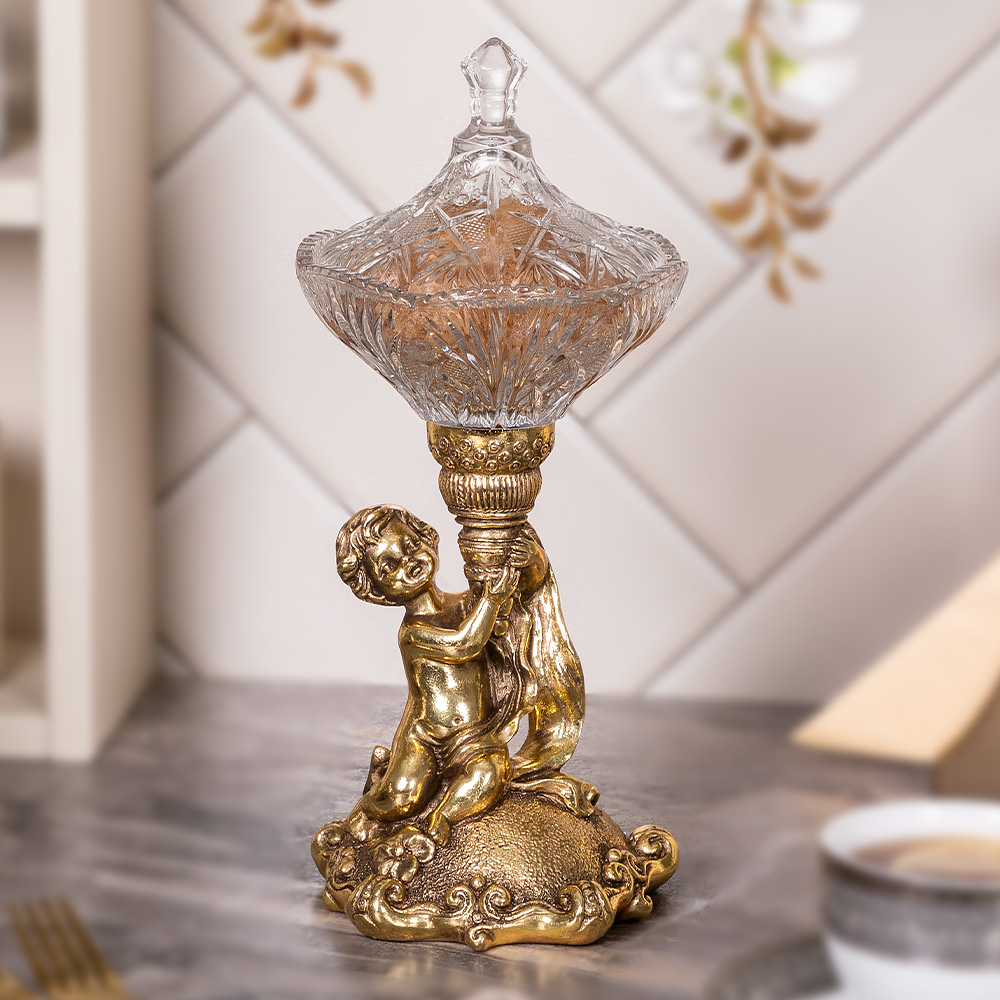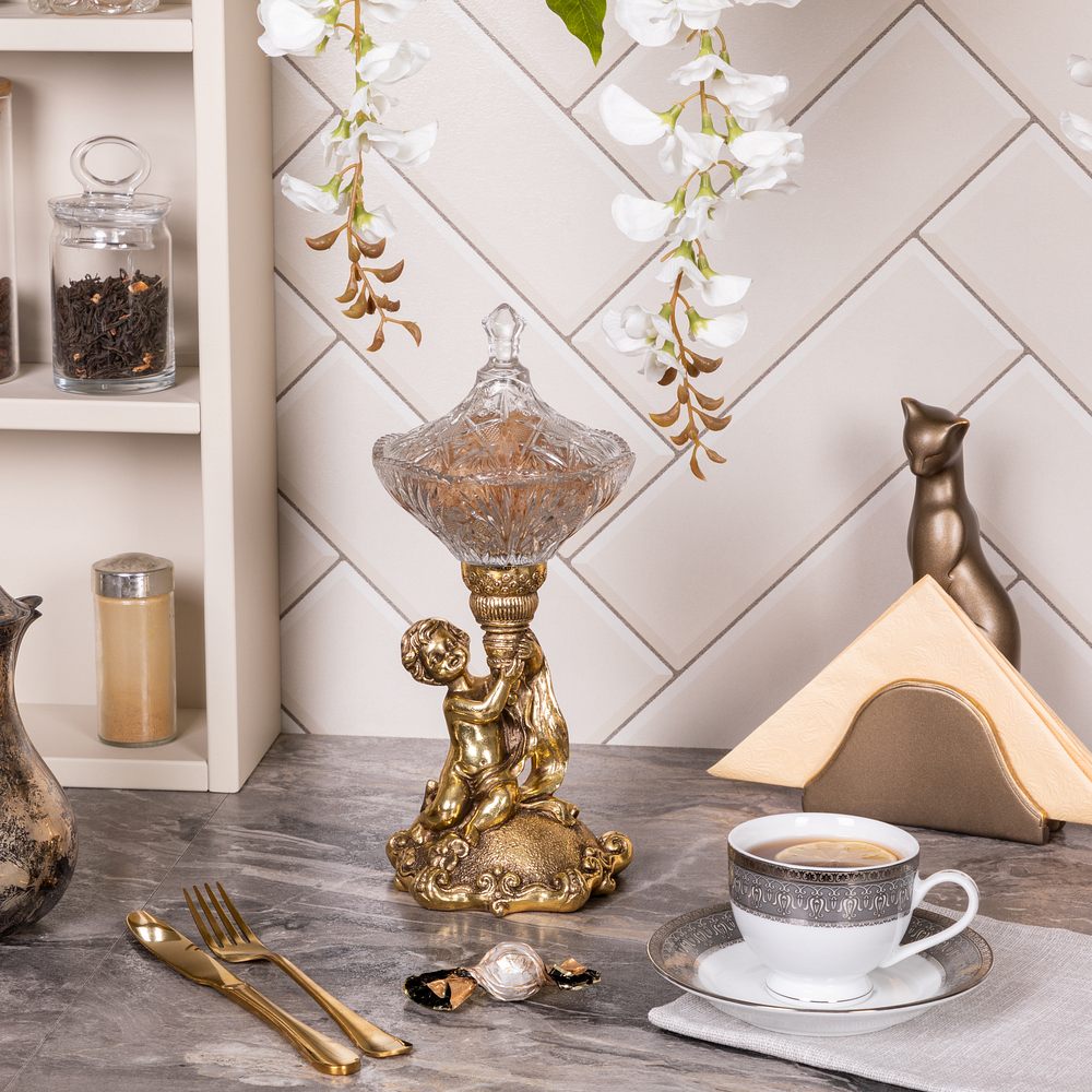 Сахарница стеклянная с крышкой Эдем - поистине царское украшение вашего стола. Изящный предмет интерьера отличной подойдет для конфет, печенья или пирожных и других десертов. Сахарница с крышкой выглядит настолько роскошно, что ее сложно отнести к просто разряду кухонных принадлежностей. Этот инвентарь для кухни или столовой - изысканный декор украшение на обеденный кухонный стол. Блюдо для подачи со стеклянной чашей разнообразно в своем функционале. Это и креманка и икорница, конфетница или фруктовница. Может использоваться как вазочка для варенья или джема. Подойдет для меда, солений и орешков. Отличный вариант для мороженого. Маленькие конфетки будут необыкновенно смотреться в ней! Сахарница запомнится Вашим гостям. Это стильный декор для дома и уюта ручной работы. Сувенир можно использовать не только как посуду для сервировки стола на кухне, но и как элемент декора в гостиную или столовую и на кухню. Конфетница подойдет для дачи или в беседку. Можно приобрести для офиса и в приемную. Сахарница с крышкой -это оригинальный подарок сувенир маме и бабушке на день матери или на новый год и рождество. Основание сахарницы выполнено из натурального материала – литьевого мрамора. Данный аксессуар для дома подойдет для интерьеров в стиле лофт и сканди, минимализм и эклектика или романтизм и вечная классика. Посуда и текстиль могут быть любыми, ведь главное украшение стола всегда у вас под рукой! Сахарница на ножке завернута в воздушно - пузырчатую пленку, ложемент и надежно упакована в коробку из гофрированного картона.
