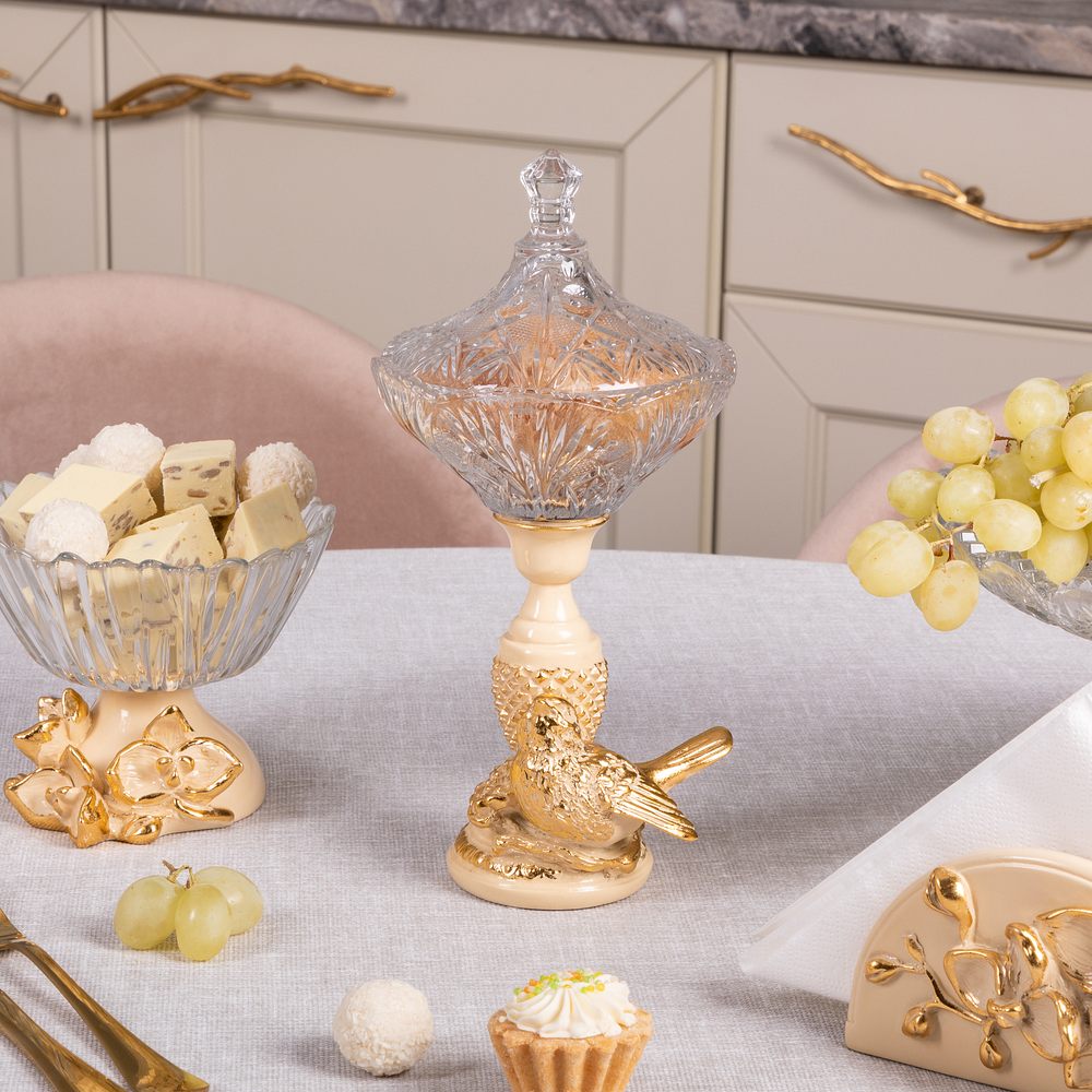 Сахарница стеклянная с крышкой Терра Сонг - поистине царское украшение вашего стола. Изящный предмет интерьера отличной подойдет для конфет, печенья или пирожных и других десертов. Сахарница с крышкой выглядит настолько роскошно, что ее сложно отнести к просто разряду кухонных принадлежностей. Этот инвентарь для кухни или столовой - изысканный декор украшение на обеденный кухонный стол. Блюдо для подачи со стеклянной чашей разнообразно в своем функционале. Это и креманка и икорница, конфетница или фруктовница. Может использоваться как вазочка для варенья или джема. Подойдет для меда, солений и орешков. Отличный вариант для мороженого. Маленькие конфетки будут необыкновенно смотреться в ней! Сахарница запомнится Вашим гостям. Это стильный декор для дома и уюта ручной работы. Сувенир можно использовать не только как посуду для сервировки стола на кухне, но и как элемент декора в гостиную или столовую и на кухню. Основание сахарницы выполнено из натурального материала – литьевого мрамора. Данный аксессуар для дома подойдет для интерьеров в стиле лофт и сканди, минимализм и эклектика или романтизм и вечная классика. Посуда и текстиль могут быть любыми, ведь главное украшение стола всегда у вас под рукой! Сахарница на ножке завернута в воздушно - пузырчатую пленку, ложемент и надежно упакована в коробку из гофрированного картона.
