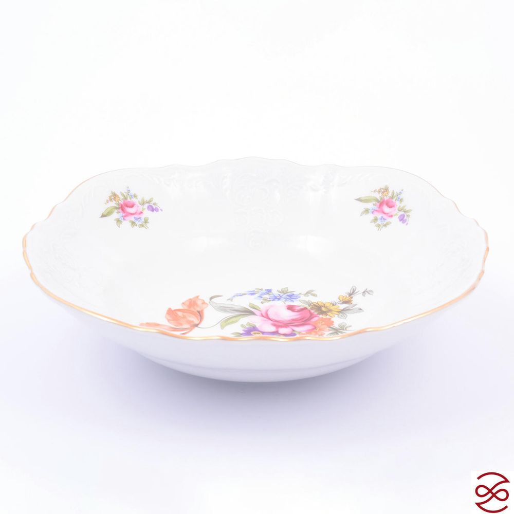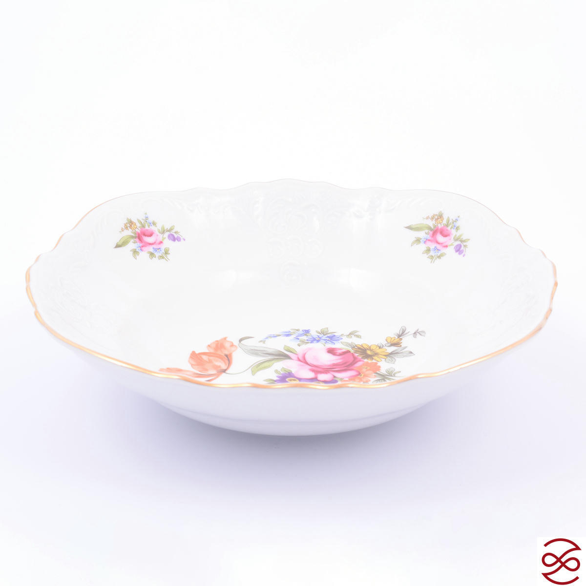 Салатник входит в базовую коллекцию фарфора серии Полевой цветок, оформленного рельефным тиснением, золотым кантом и декором в виде красочных букетов.