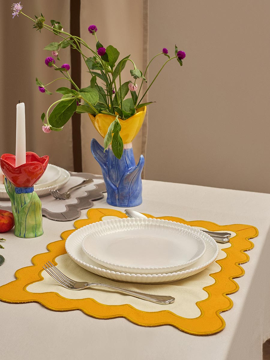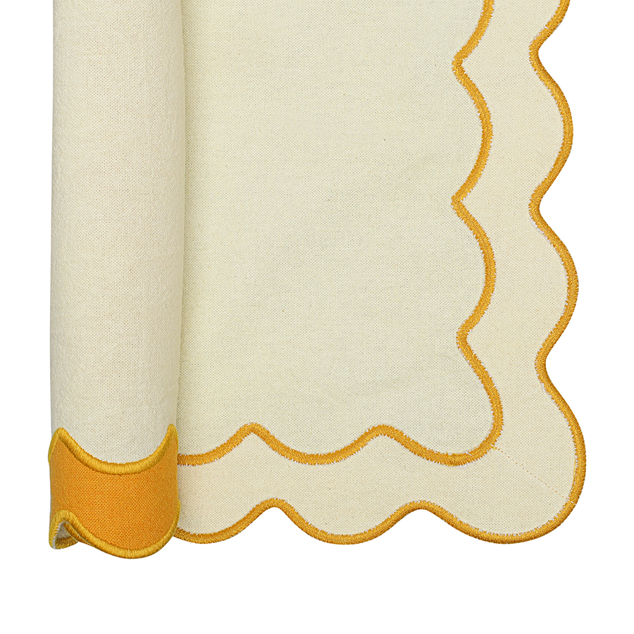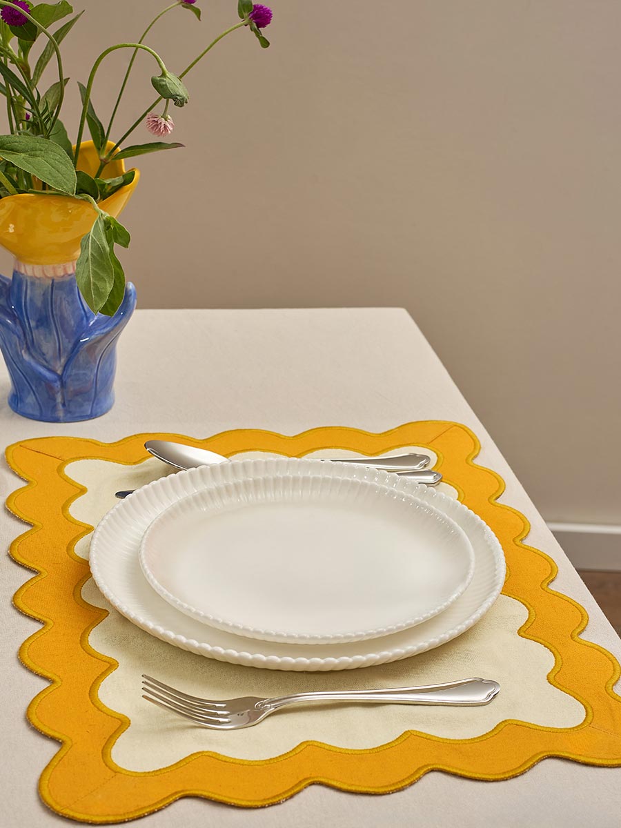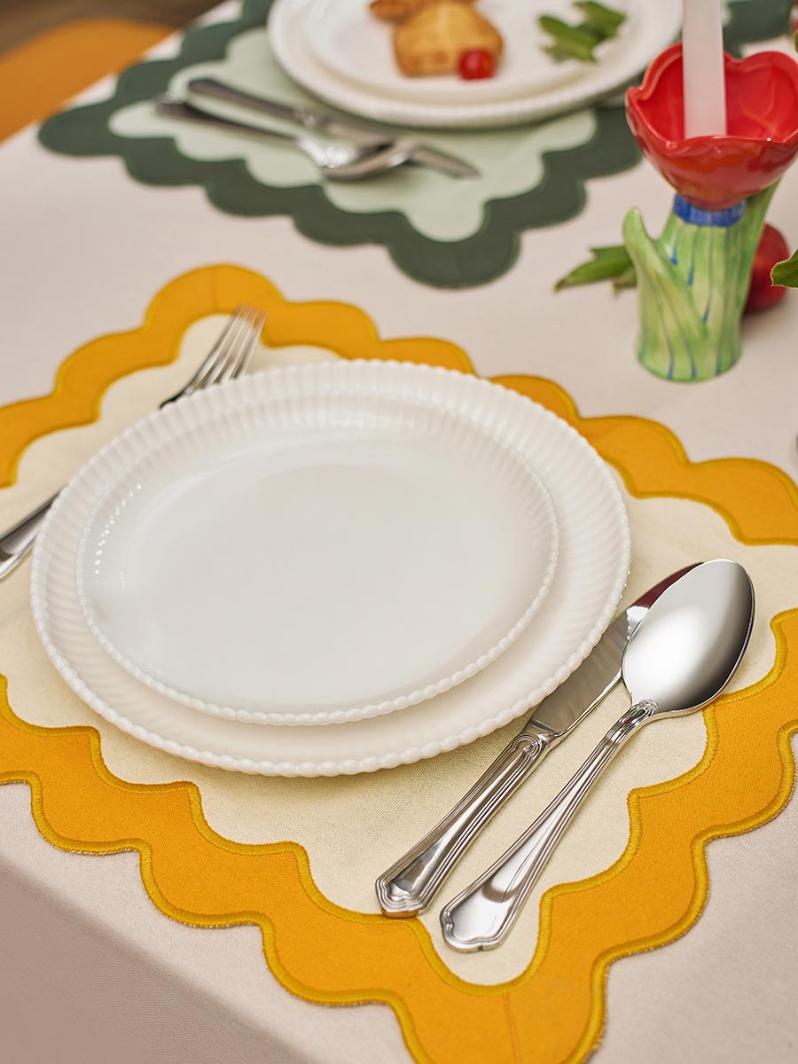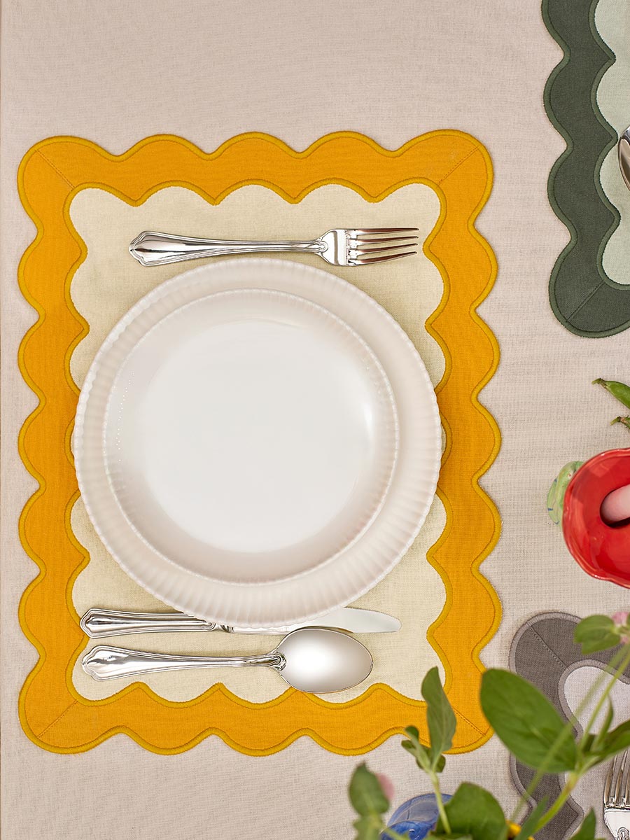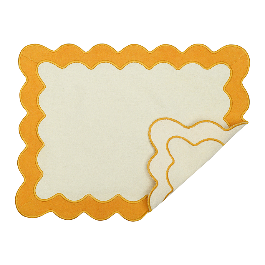 Салфетка под приборы с контрастным кантом горчичного цвета из коллекции Trendy Ruffles сделает любую сервировку стильной, позволив экспериментировать с текстурами и формами. Текстиль с волнистой отделкой, напоминающей изящные раковины морских гребешков, стал ярким элементом стиля Ар Деко – и сейчас возвращается в моду, появляясь в самых актуальных интерьерных решениях.
