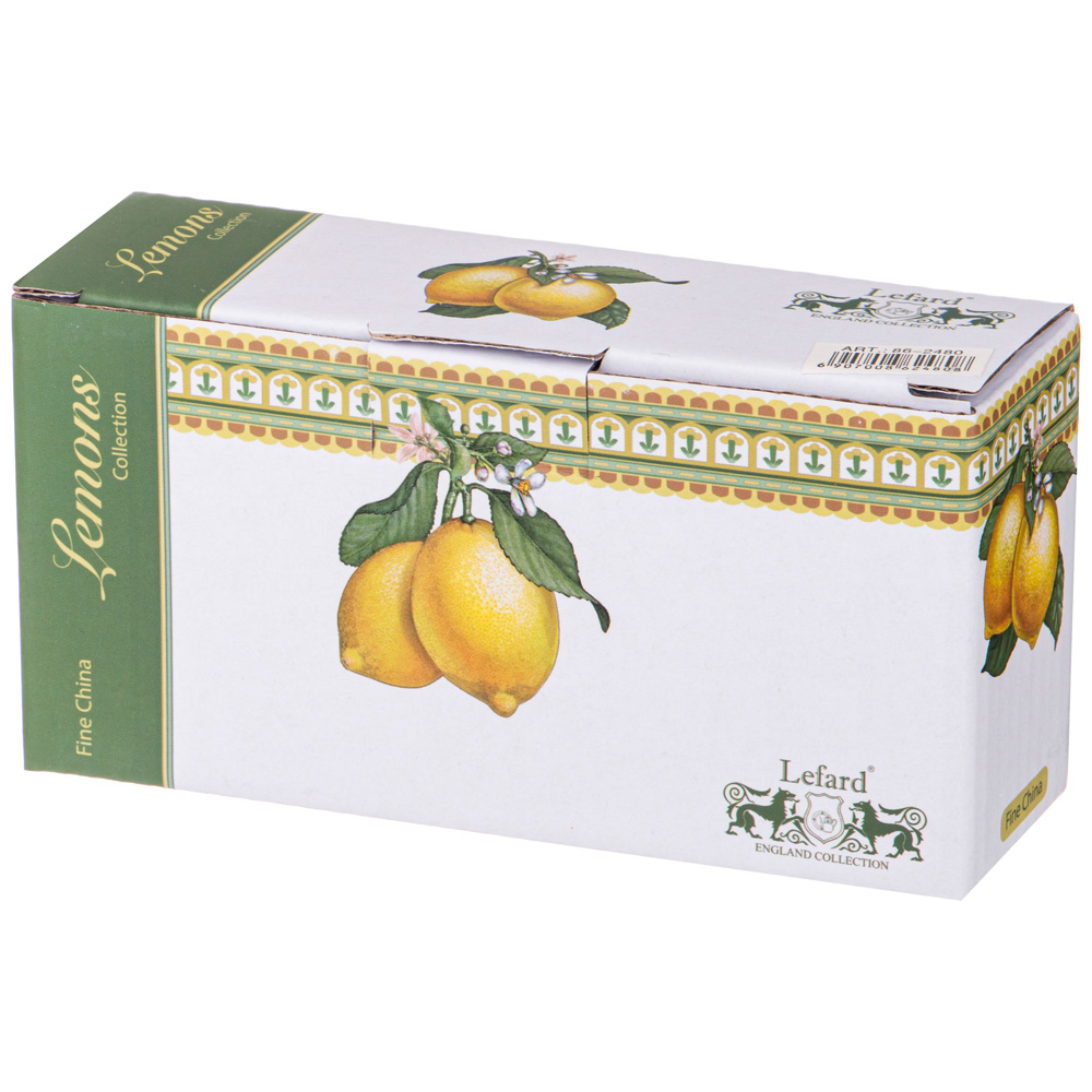 ТМ LEFARD авторская коллекция «Лимоны» - это вкус и элегантность в сервировке стола и несомненное украшение в интерьере кухни. Изделия выполнены из тонкого, легкого и прочного магнезийного фарфора, способны красиво звучать. При постукивании деревянной палочкой по стенкам фарфоровой чашки она отзовется долгим чистым звуком, как если бы вы держали в руке колокольчик. Красивая деколь, сочетающая оригинальный орнамент с выразительными лимонами. Натуральные, приятные глазу оттенки, всегда в тренде. Мягкие формы и удобные размеры и объемы посуды помогут сервировать стол и создадут непринужденную домашнюю атмосферу. Красочная упаковка. Прекрасный подарок. Продукция прошла сертификацию и безопасна для контакта с пищевыми продуктами. Можно смело мыть в посудомоечной машине с применением мягких моющих средств, использовать в микроволновой печи.