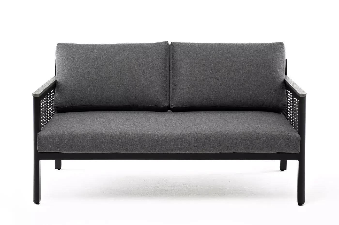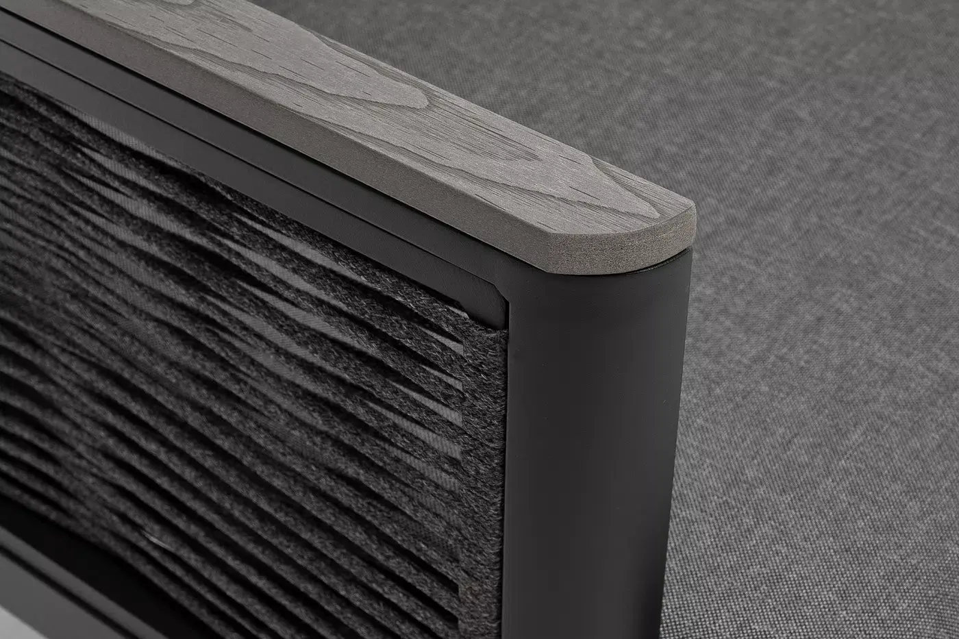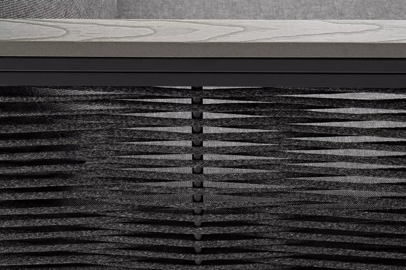 Каркас выполнен из высококачественного алюминия и окрашен порошковой краской в темно-серый цвет. Боковые стороны подлокотников вручную оплетены эластичными синтетическими лентами серого оттенка, состоящие из высокопрочных полиэфирных волокон.