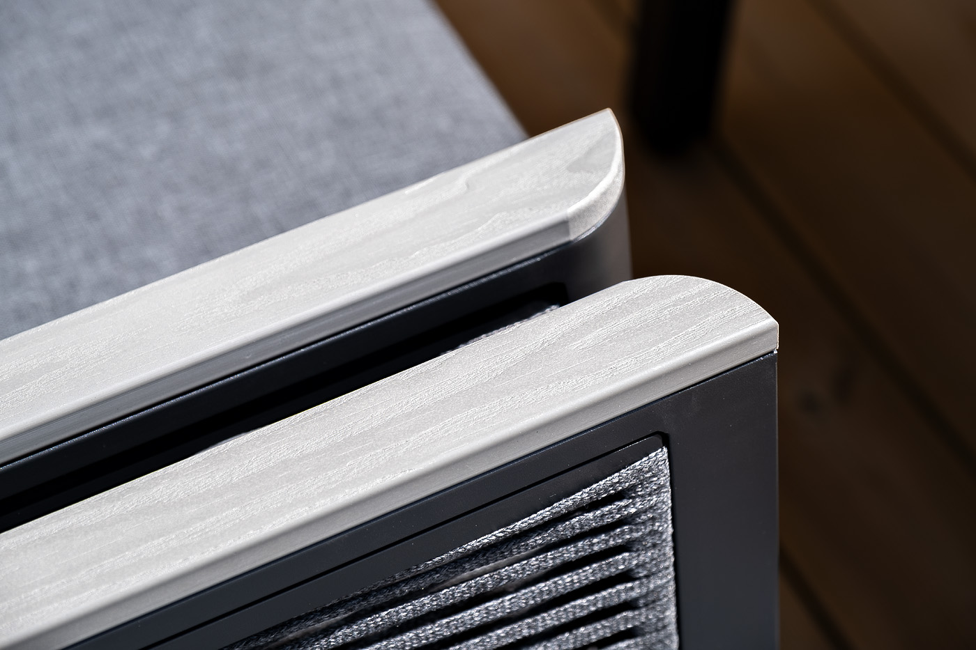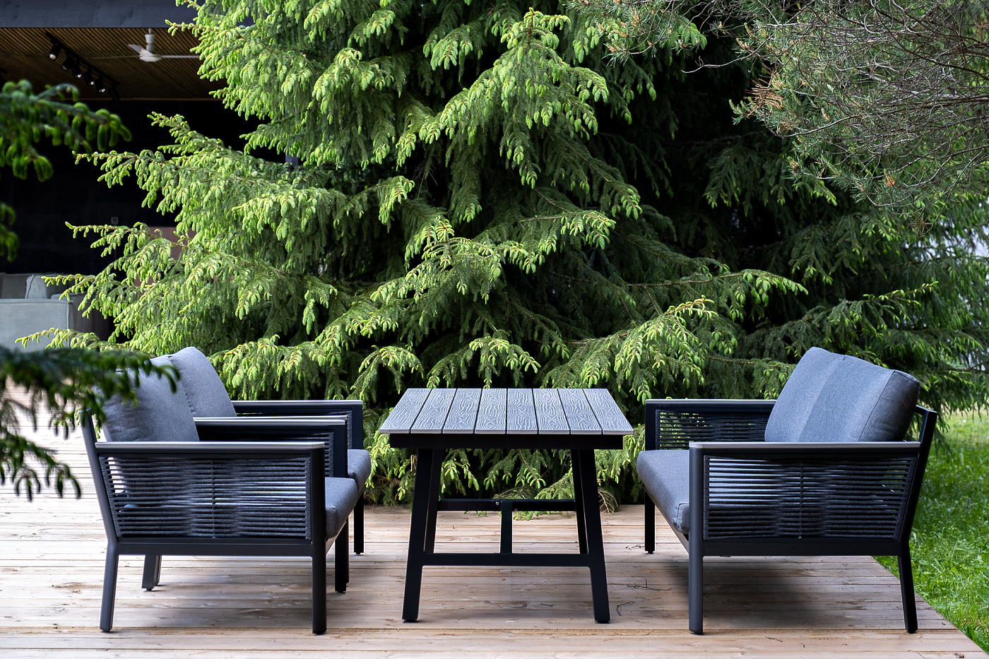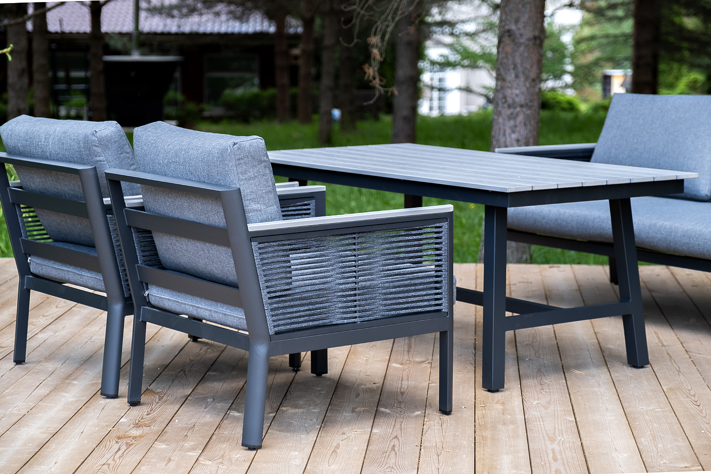 Диван и кресла оснащены подушками серого цвета со съёмными чехлами. Стол со столешницей из ДПК.