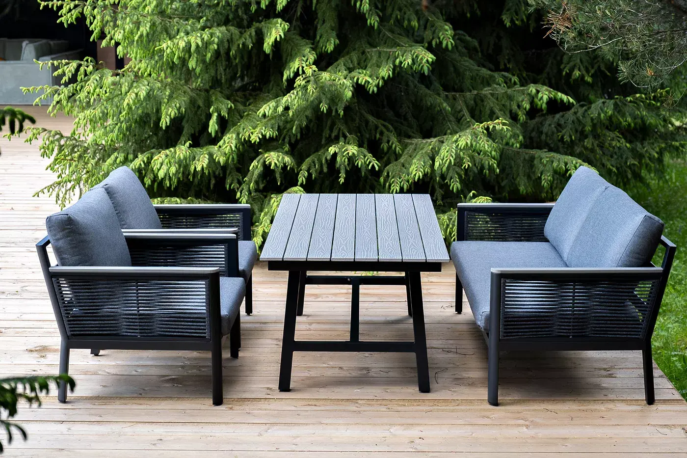 Диван и кресла оснащены подушками серого цвета со съёмными чехлами. Стол со столешницей из ДПК.
