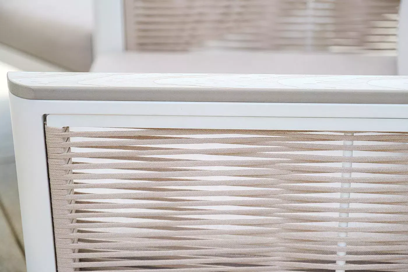 Размер модели – 680×780×700 мм. Ее каркас выполнен из высококачественного алюминия и окрашен порошковой краской в белый цвет. Боковые стороны подлокотников вручную оплетены эластичными синтетическими лентами серо-коричневого оттенка, состоящие из высокопрочных полиэфирных волокон.