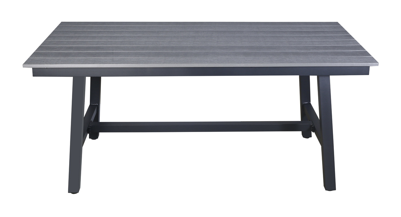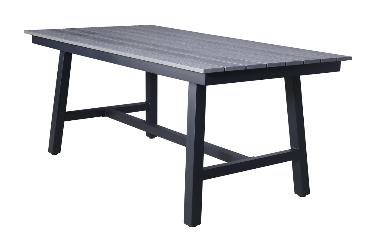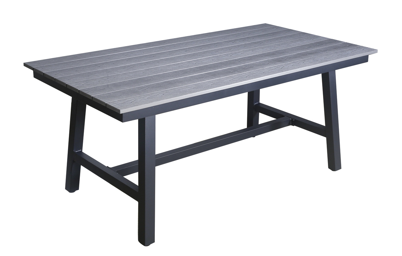 Подстолье изготовлено из легкого алюминия, окрашенного в темно-серый цвет износостойкой порошковой краской, столешница – из композитного материала ДПК серого цвета.