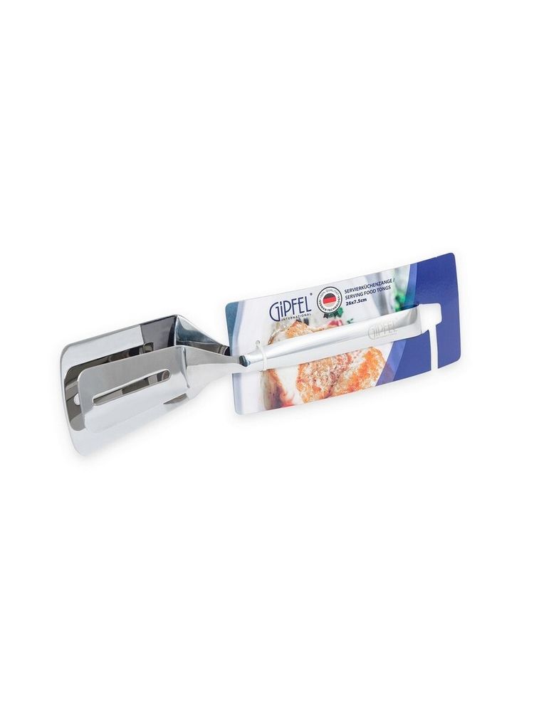 Щипцы сервировочные для подачи блюд Gipfel 9994. Щипцами удобно подавать мясные стейки, жареную рыбу, бутерброды – за счет увеличенной площади их нижней части пища держится крепко. Длина щипцов 26 см, ширина 7,5 см. Щипцы сделаны из нержавеющей стали.