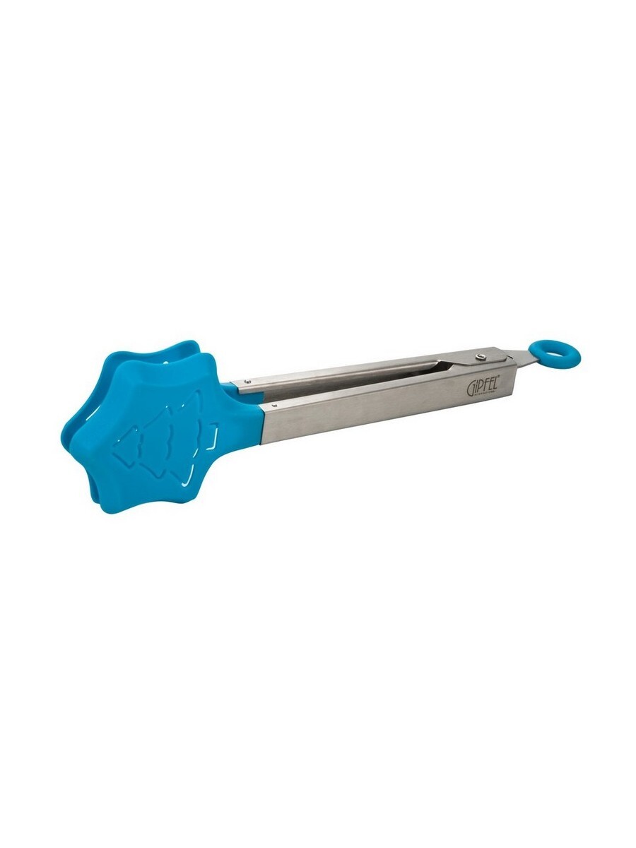 Щипцы кухонные Gipfel Carnival 9984. Щипцы выполнены в форме голубых звездочек. Серия Carnival от бренда Gipfel — это практичные щипцы для продуктов, которые обязательно понравятся современной хозяйке. Нержавеющая сталь 18/0 и нейлон, из которых изготовлен аксессуар — очень удобное и долговечное сочетание. Металл устойчив к ударам и повреждениям другого характера, имеет характерный серый оттенок и блеск, которые хорошо впишутся в интерьер. Рабочая часть прибора сделана из нейлона — этот материал будет просто идеальным, если ваша сковорода имеет антипригарное покрытие. Также щипцы можно использовать с посудой из эмалированного покрытия. После контакта с нейлоновой рабочей поверхностью оно останется в первозданном состоянии. За резиновое кольцо на конце ручки прибор можно будет подвесить, чтобы он не занимал лишнее место в шкафу или на сушке. Щипцы для продуктов имеют длину 25,5см.
