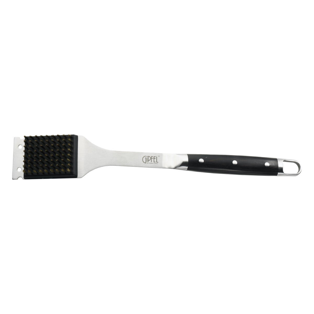 Щётка для чистки гриля GIPFEL MODENA 51263. Длина 41,5 см. Инструмент сделан из нержавеющей стали 2Cr14. Толщина 1,8 мм. Ручка выполнена из древеснослоистого пластика. На ручке имеется петля для подвешивания.