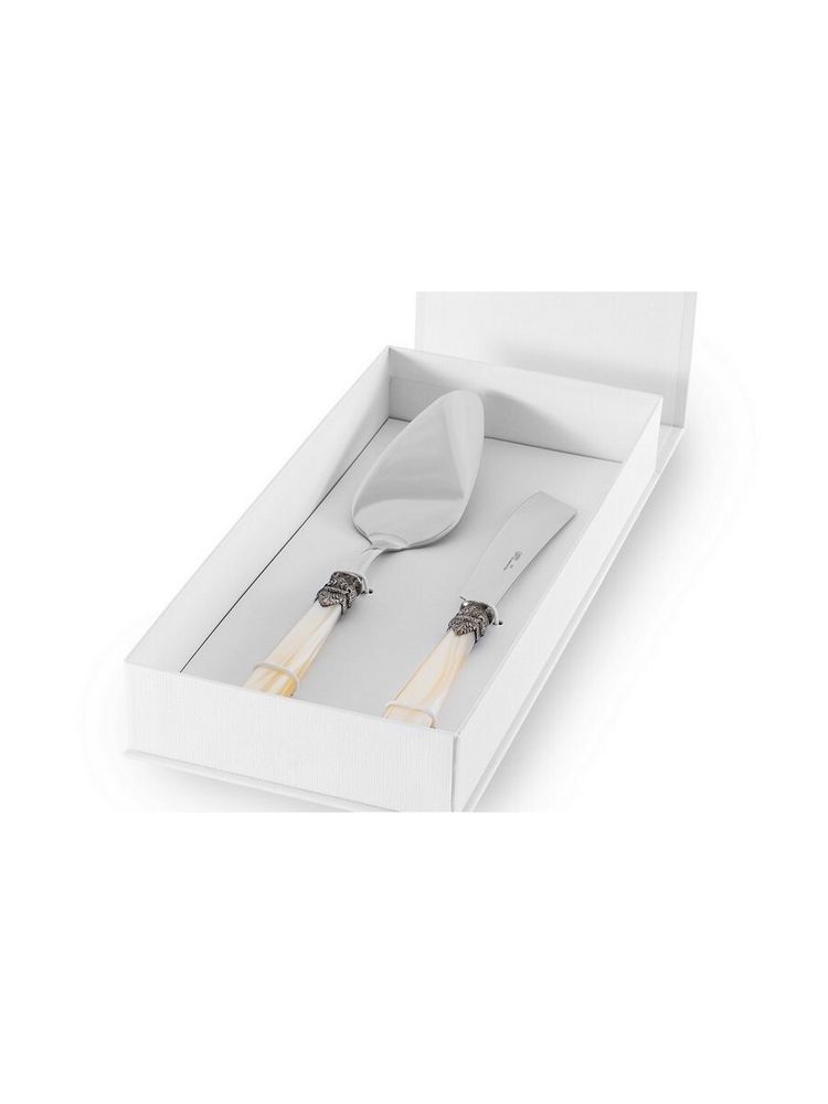 Набор сервировочный для десертов Gipfel ROYAL 8622. В наборе 2 предмета: нож и лопатка для торта. Изготовлены из высококачественной нержавеющей стали марки 18/10, отличающейся особой прочностью и долговечностью. Ручка приборов выполнена в светло-золотистом цвете из прочного метакрила. Набор упакован в подарочный короб белого цвета.