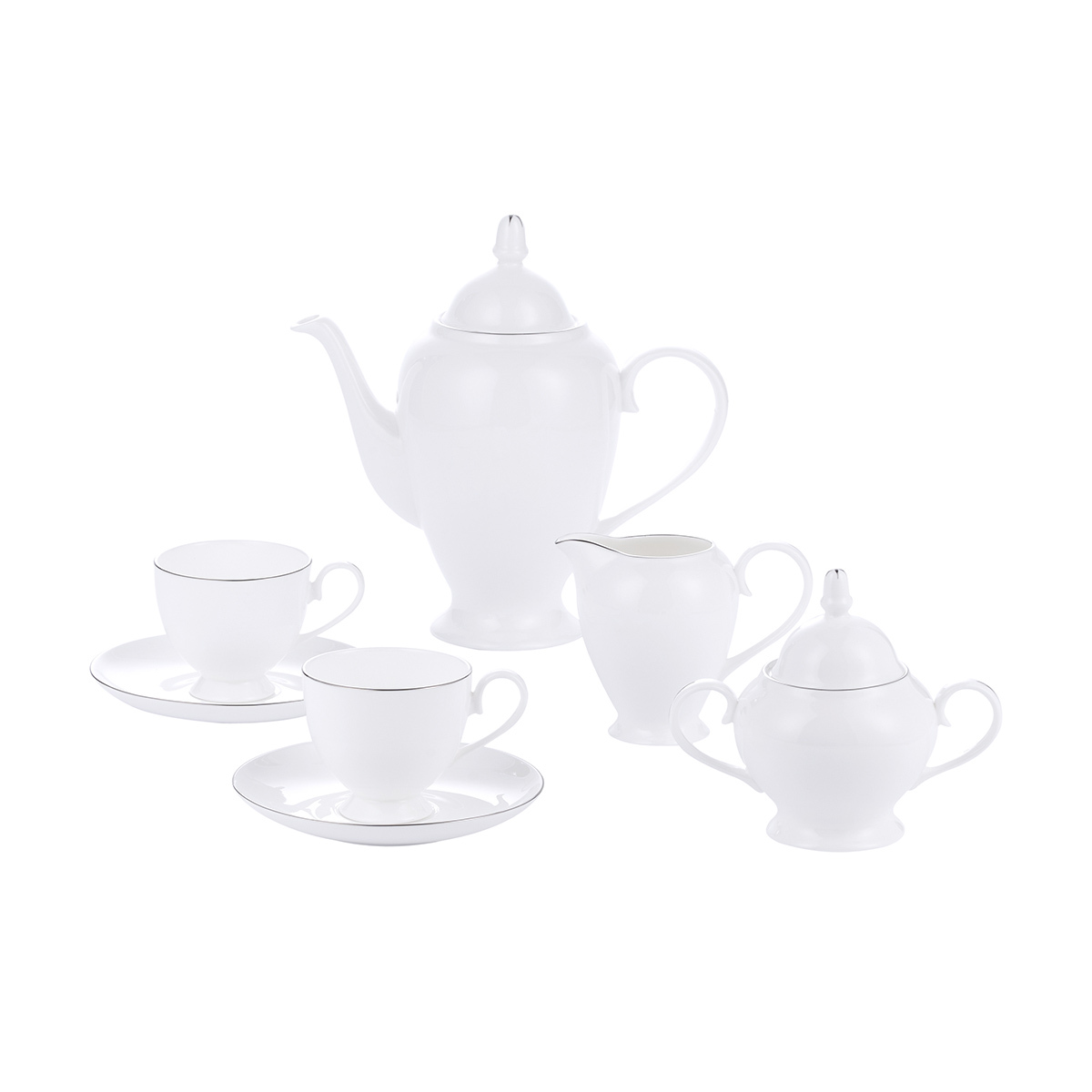 Сервиз чайный Gipfel ELEGANZA 40718 на 4 персоны, 11 предметов. Чайник заварочный, 1450мл, 1шт., Сахарница, 400мл, 1шт., Молочник, 330мл, 1шт., Чашка, 230мл, 4шт., Блюдце 15 см, 4шт. Цвет: белый с ободком серебристого цвета. Материал: костяной фарфор.