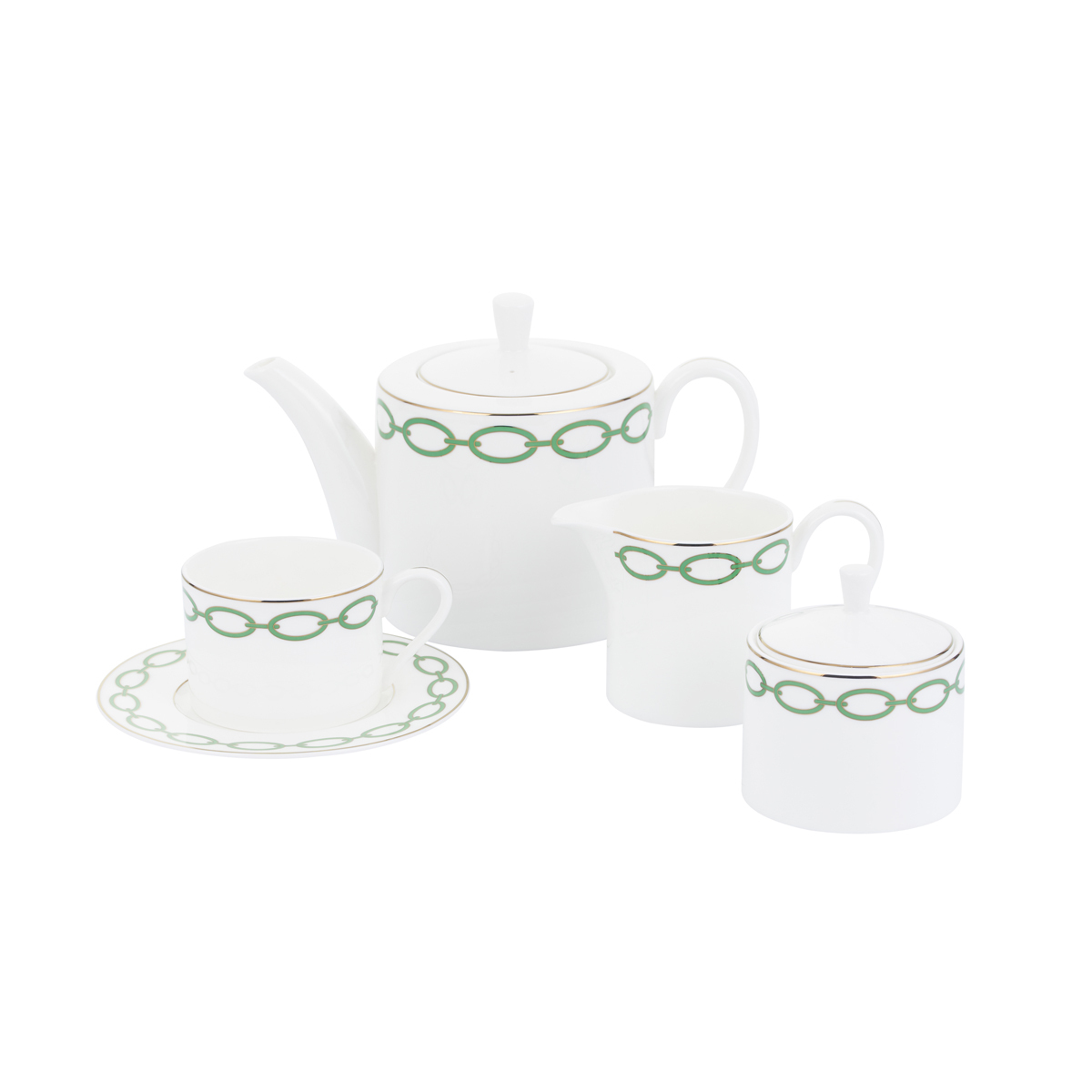 Сервиз чайный Gipfel ROME 42209 из 15 предметов. Сервиз рассчитан на 6 персон. В наборе: чайник заварочный 1000мл, сахарница 250мл, молочник 300мл, 6 чашек объемом 250мл, 6 блюдец объемом 16 см. Сервиз сделан из белого костяного фарфора с золотой каймой и зеленым рисунком по краю.