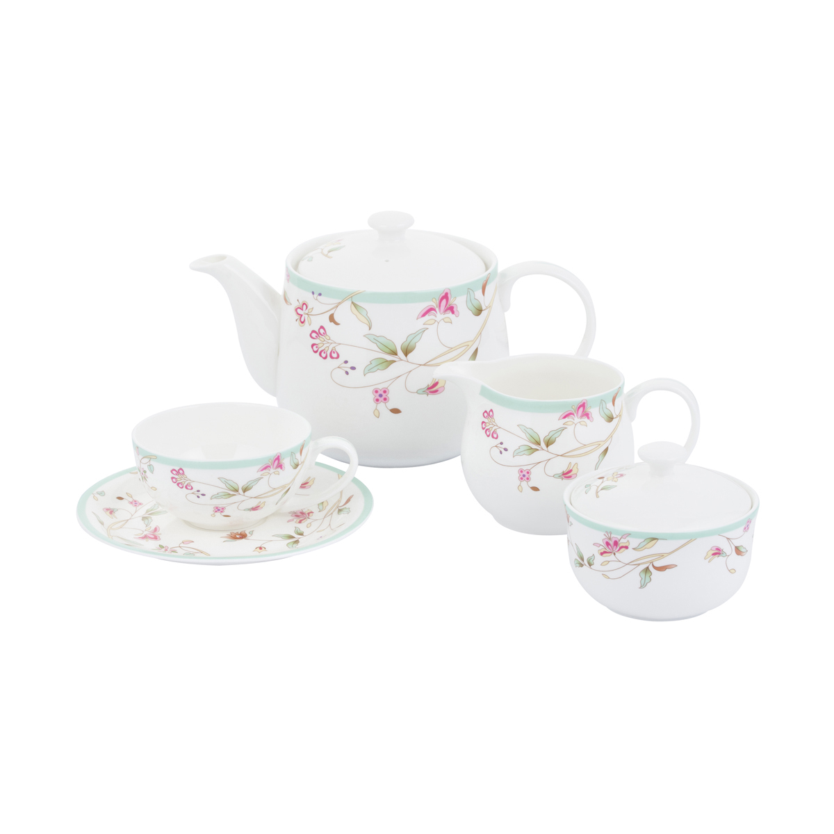 Сервиз чайный Gipfel Verde 42206 из 15 предметов. Сервиз рассчитан на 6 персон. В наборе: чайник заварочный 1200мл, сахарница 260мл, молочник 400мл, 6 чашек объемом 250мл, 6 блюдец диаметром 17 см. Сервиз сделан из белого костяного фарфора с бирюзовой каймой и цветочным рисунком.