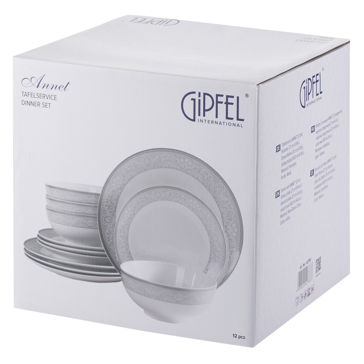 Сервиз столовый Gipfel Annet 42783. В наборе 12 предметов из фарфора: тарелка обеденная 27 см (4 шт.), тарелка закусочная 20 см (4 шт.), салатник 600 мл (4 шт.).