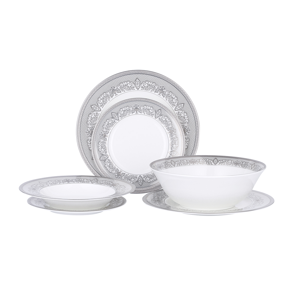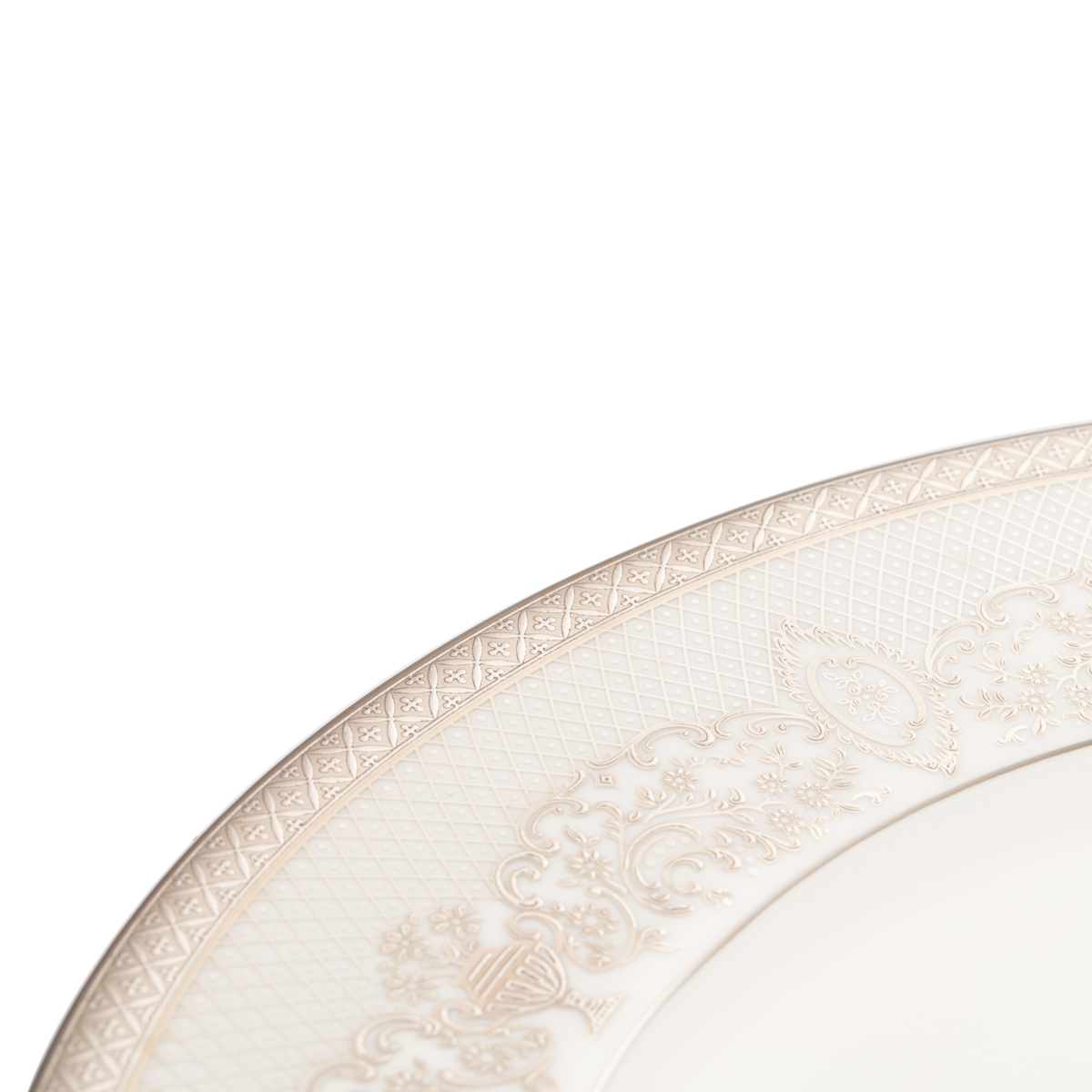 Сервиз столовый GIPFEL ARGENTO 40988 на 6 персон, 19 предметов: тарелка обеденная 27см, 6шт., тарелка закусочная, 23см, 6шт, тарелка суповая, 23,5см, 6шт. салатник, 24см, 1шт. Цвет: белый с серебристым кантом. Материал: премиальный фарфор.