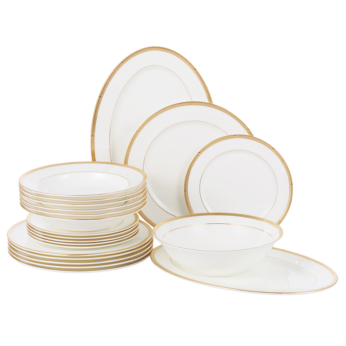 Сервиз столовый Gipfel Arlett 43254 21 предмет на 6 персон: тарелка суповая 23 см (6 шт.), тарелка обеденная 26 см (6 шт.), тарелка закусочная 20 см (6 шт.), тарелка сервировочная 36х24 см (2 шт.), салатник 1400 мл. Материал: костяной фарфор. Цвет: белый.