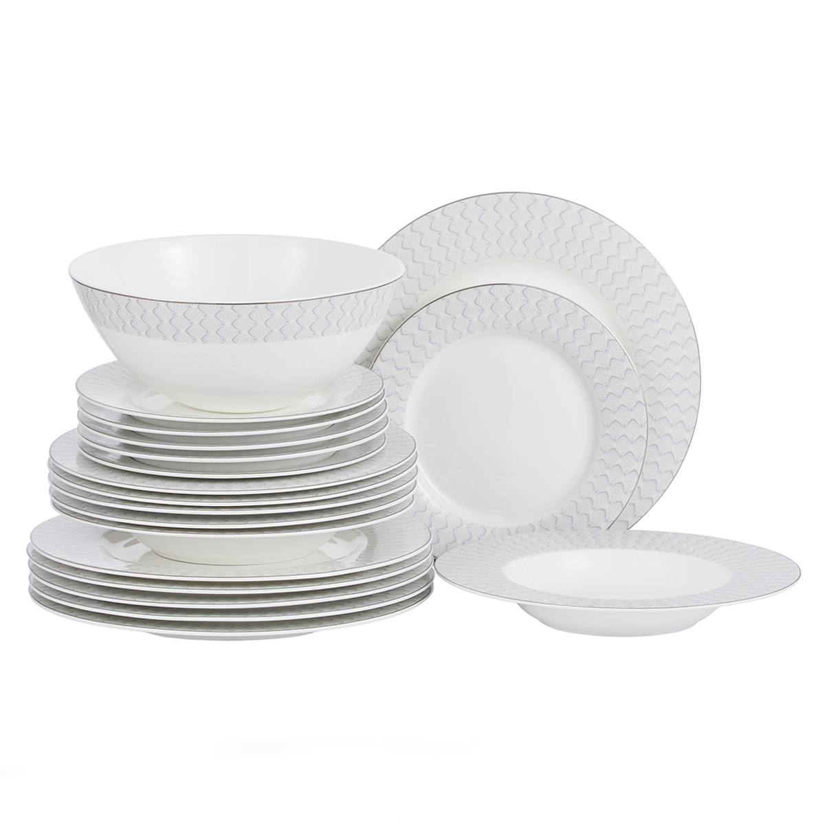 Сервиз столовый Gipfel Caroline 42930 19 предметов: тарелка суповая 24 см (6 шт.), тарелка обеденная 27 см (6 шт.), тарелка закусочная 20 см (6 шт.), салатник 1600 мл. Материал: костяной фарфор.