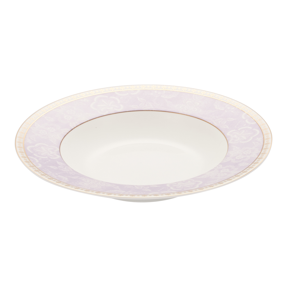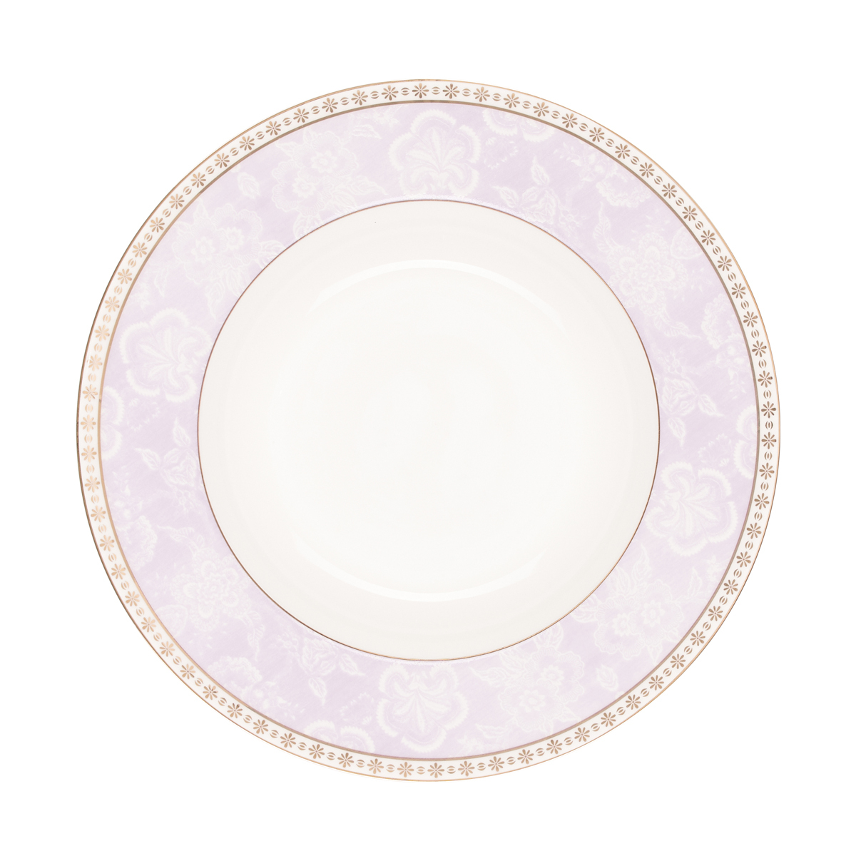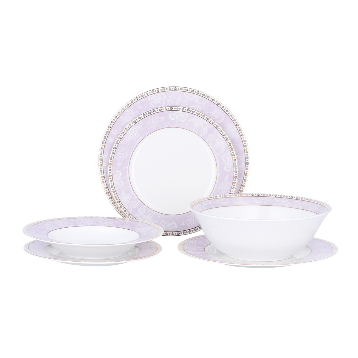 Сервиз столовый Gipfel LILLA 40979 на 6 персон, 19 предметов: тарелка обеденная 27 см, 6шт., тарелка закусочная, 23 см, 6шт, тарелка суповая, 23,5 см, 6шт. салатник, 24 см, 1шт. Цвет: белый с сиреневым кантом. Материал: премиальный фарфор.