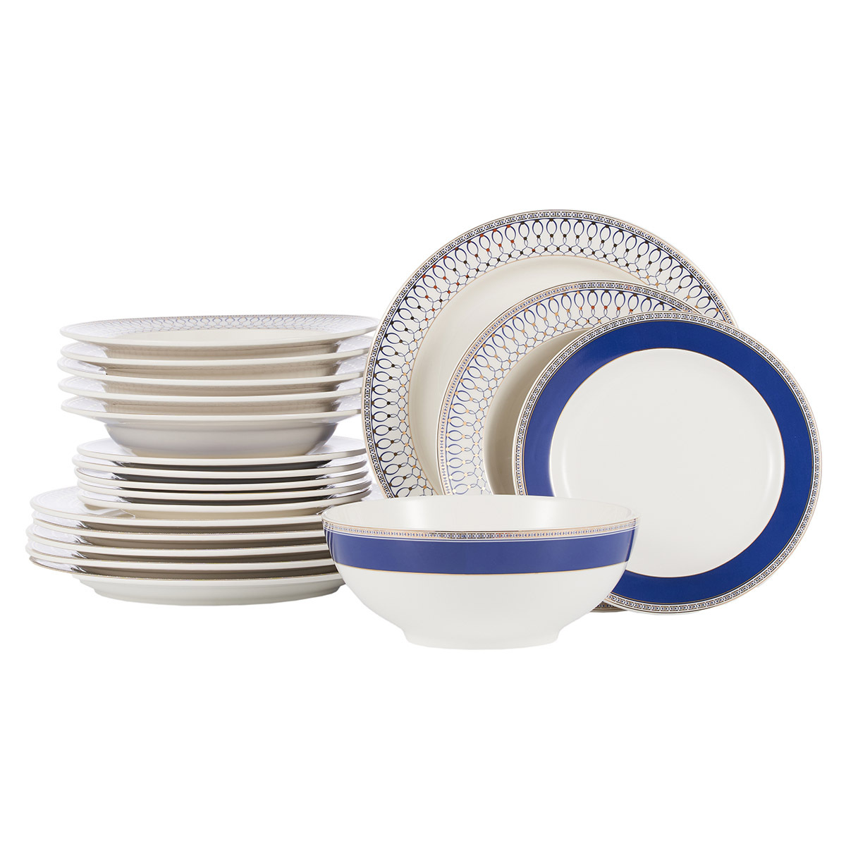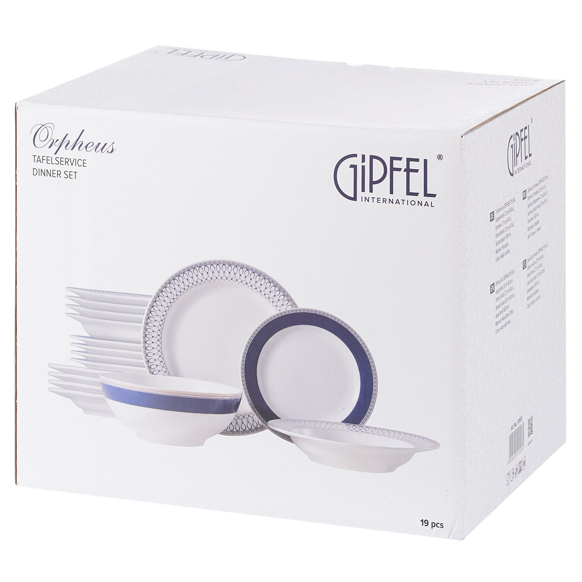 Сервиз столовый Gipfel Orpheus 51553 19 предметов: тарелка суповая 23 см (6 шт), тарелка обеденная 27 см (6 шт.), тарелка закусочная 20 см (6шт.), салатник 1500 мл, 1 шт. Материал: фарфор. Цвет: белый с синим.