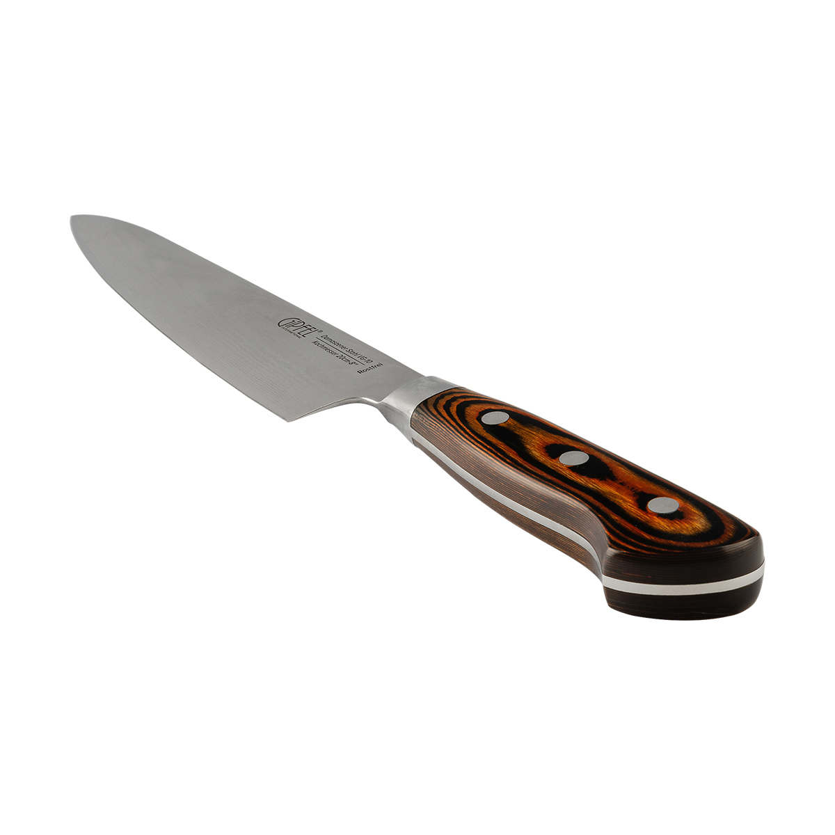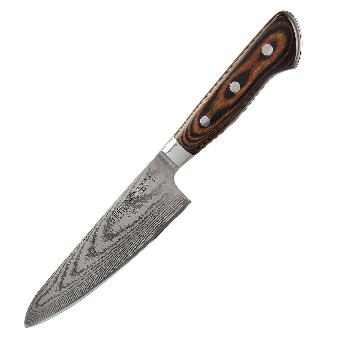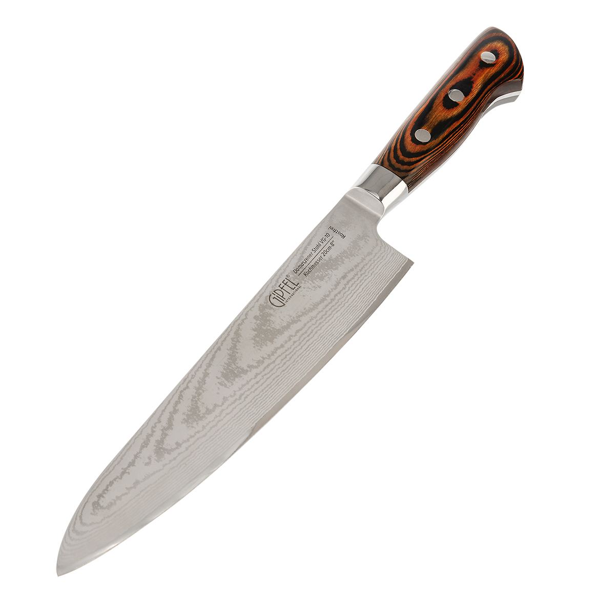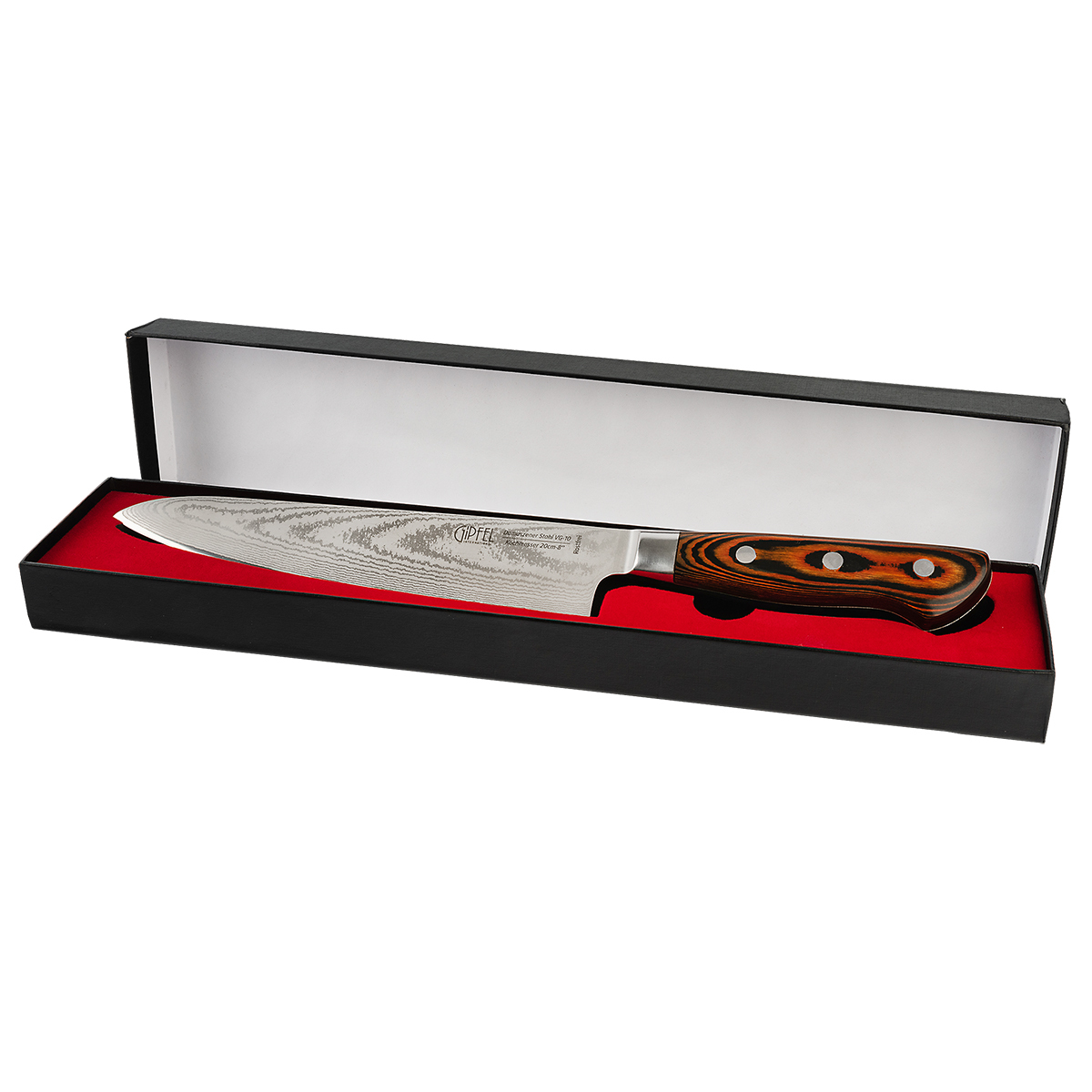 Нож шеф-повара GIPFEL KYOTO 8413. Размер лезвия 20,3 см. Толщина лезвия 2,5мм. Лезвие изготовлено из дамасской стали VG10. Ручка: высокого класса Pakka.