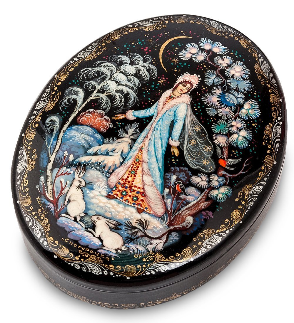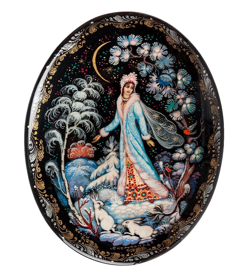 На поверхности шкатулки изображен образ Снегурочки, которая гуляет в лесу, наслаждаясь зимней красотой. Сюжетную линию рисунка дополняют изображения лесных зверей и птиц, деревьев, а также витающих вокруг снежинок. Роспись шкатулки «Снегурочка» нанесена на черный фон, благодаря чему рисунок выглядит по-особенному выразительно и ярко.