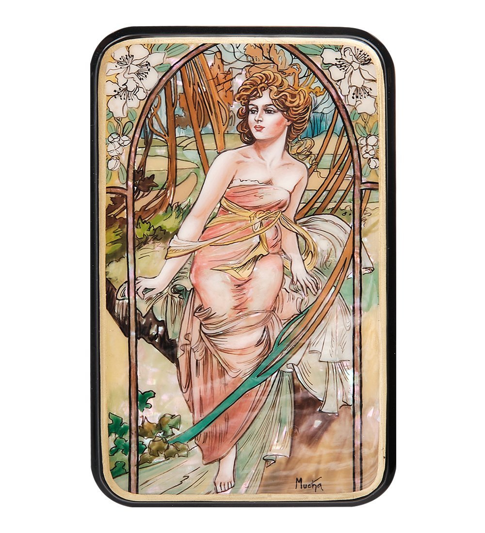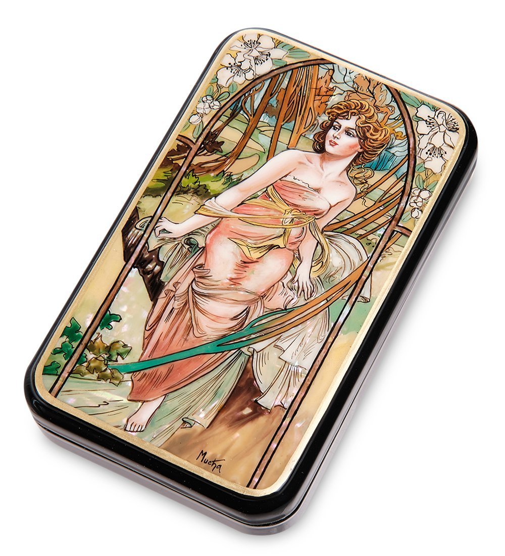 Как вы выглядите утром? Многие из нас не захотят не только отвечать на этот вопрос, но даже вспоминать о своем внешнем виде до приема душа и приведения в порядок прически. На шкатулке «Утреннее пробуждение» художница Маркова изобразила миниатюру, выполненную по мотивам одноименного полотна Альфонса Мухи; на крышке изображена молодая женщина в ночном наряде, которая вовсе не стесняется своего «утреннего» вида.