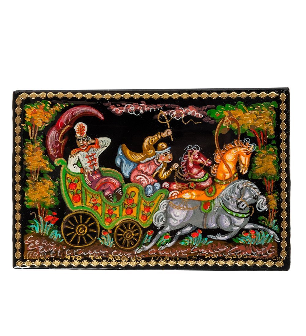 Небольшая кубическая шкатулка с дополнительным отделением-ящичком, имеющая форму маленькой толстой книги в твердом переплете, оформлена палехской миниатюрой и предназначена для дарения. Красочная миниатюра изображает русскую дорогу и мчащуюся по ней тройку лошадей, запряженную в открытую карету зеленого цвета. Ямщик размахивает кнутом, пытаясь ускорить и без того быстрый бег лошадей, а генерал, сидящий в карете, с нетерпением оглядывает окрестности.