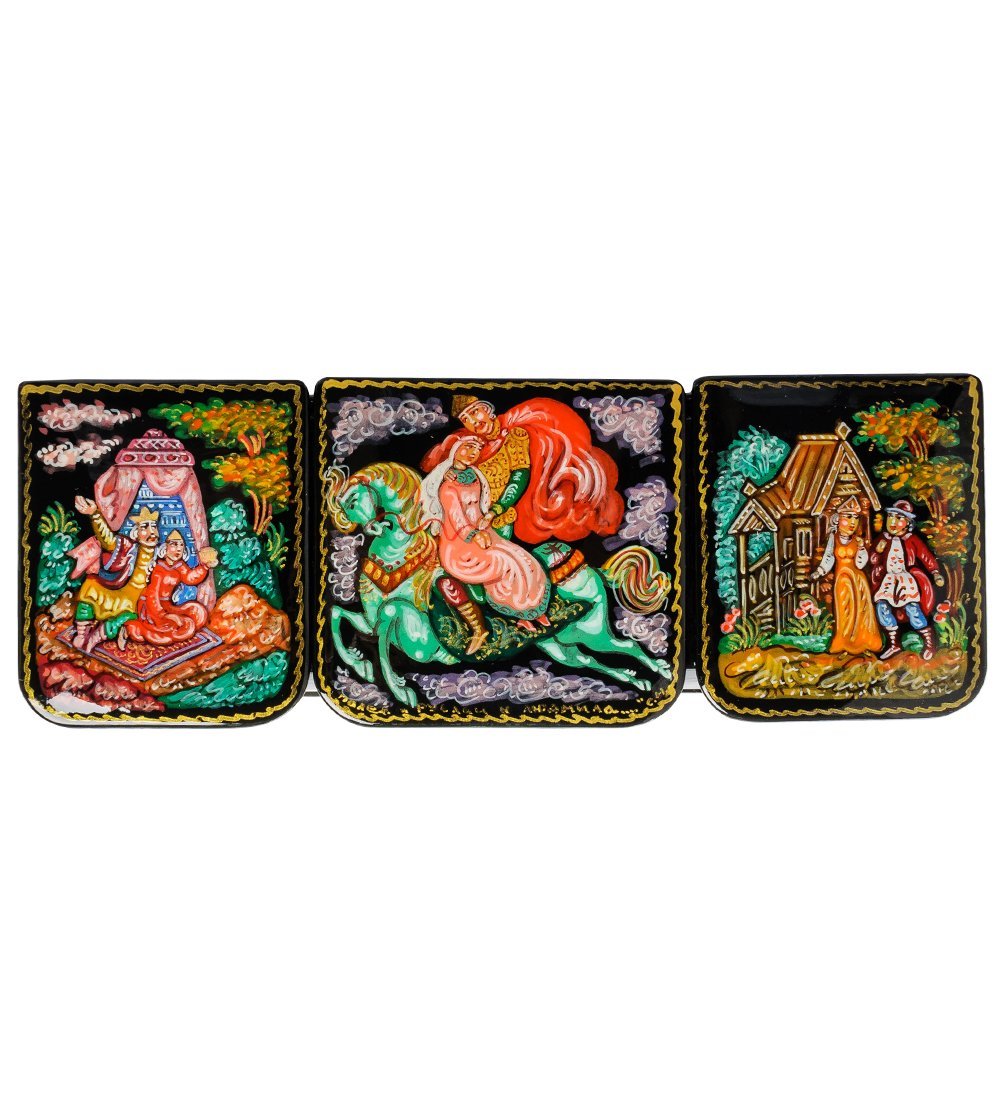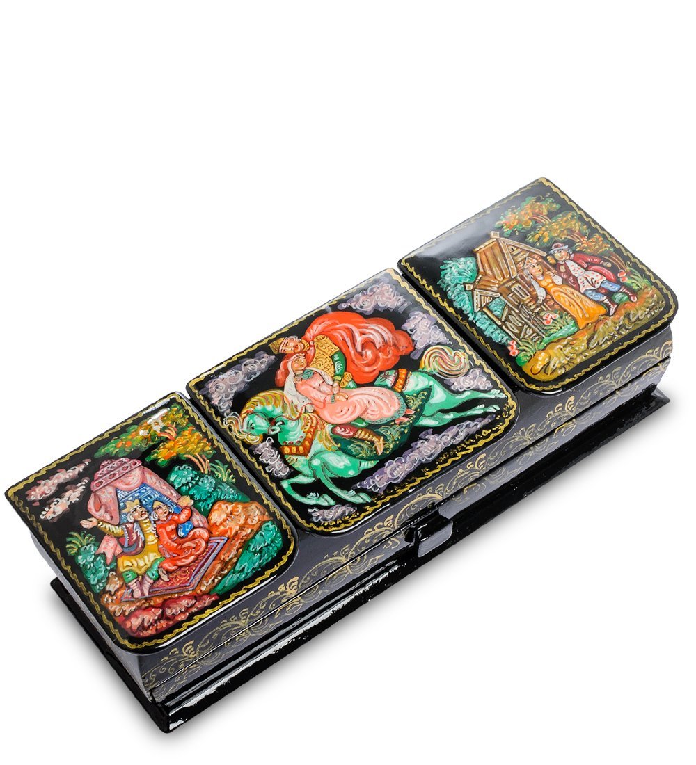 Женская шкатулка «Руслан и Людмила», оформленная в русском народном стиле Палех, обычна и необычна одновременно. Она имеет продолговатую прямоугольную форму, но не одно отделение, как обычно, а целых четыре. Ее предназначение – радовать красотой, про-свещая незнакомых с русскими сказками, и хранить женские украшения.