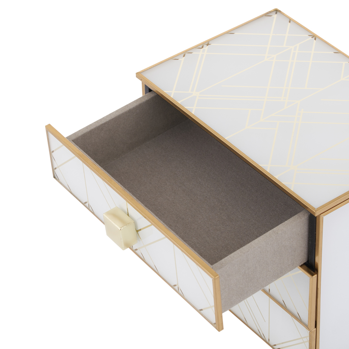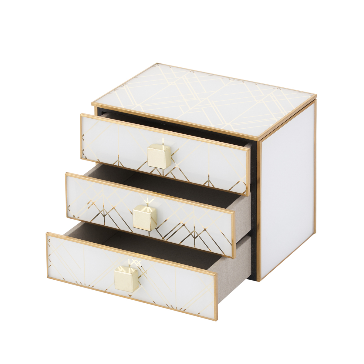 Шкатулка для украшений GIPFEL GOLDEN LINES 41254. Размер шкатулки 14x16 см. У шкатулки 3 выдвижных ящика. Белый основной цвет дополняют золотые линии и жемчужные ручки. Материал: МДФ, стекло.