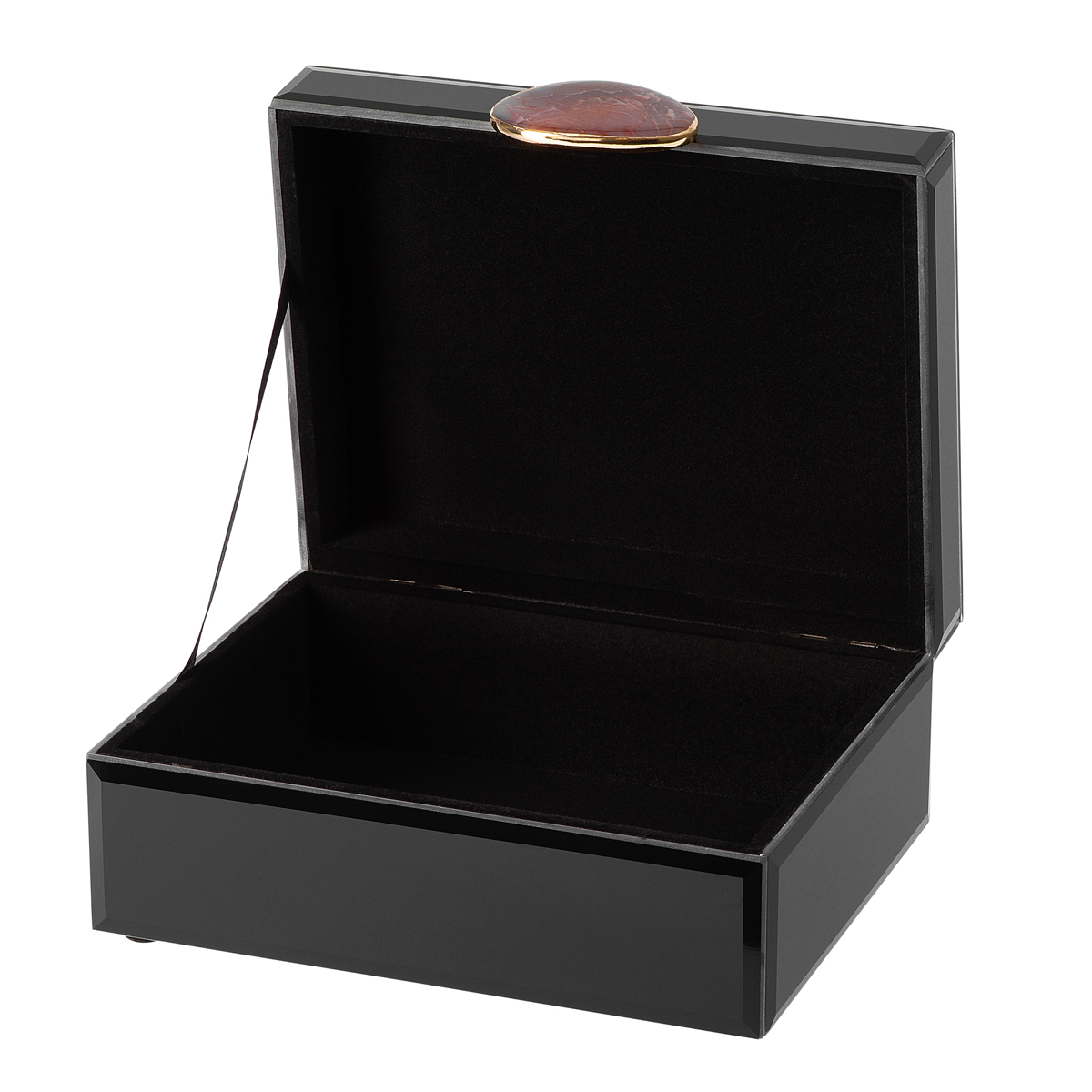 Шкатулка Gipfel Agate 42874. Размер 19x15x8 см. Изготовлена из МДФ и стекла. Поверхность глянцевая черная стеклянная. Массивный натуральный красный агат с золотым фольгированным кантом.