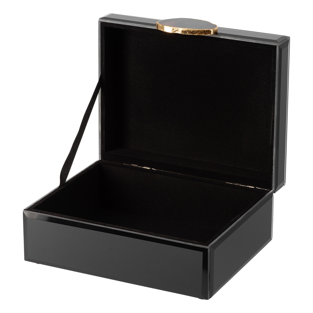 Шкатулка Gipfel Augusta 42878. Размер 19x15x8 см. Изготовлена из МДФ и стекла. Поверхность глянцевая черная стеклянная. Украшение из натурального кофейного агата с золотой фольгированной окантовкой расположено на крышке в виде ручки.
