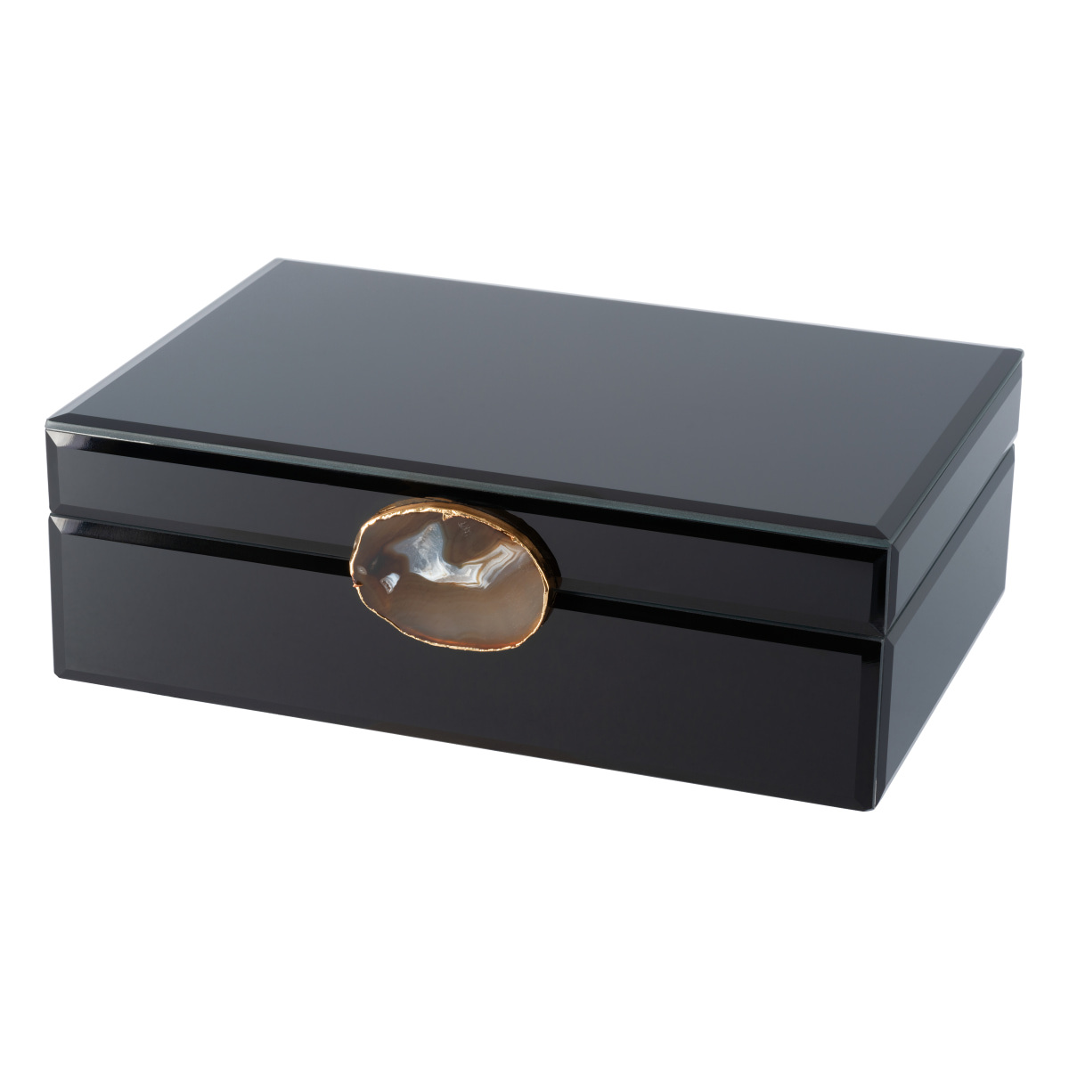 Шкатулка Gipfel Augusta 42879. Размер 24x16x8 см. Изготовлена из МДФ и стекла. Поверхность глянцевая черная стеклянная. Украшение из натурального кофейного агата с золотой фольгированной окантовкой расположено на крышке в виде ручки.