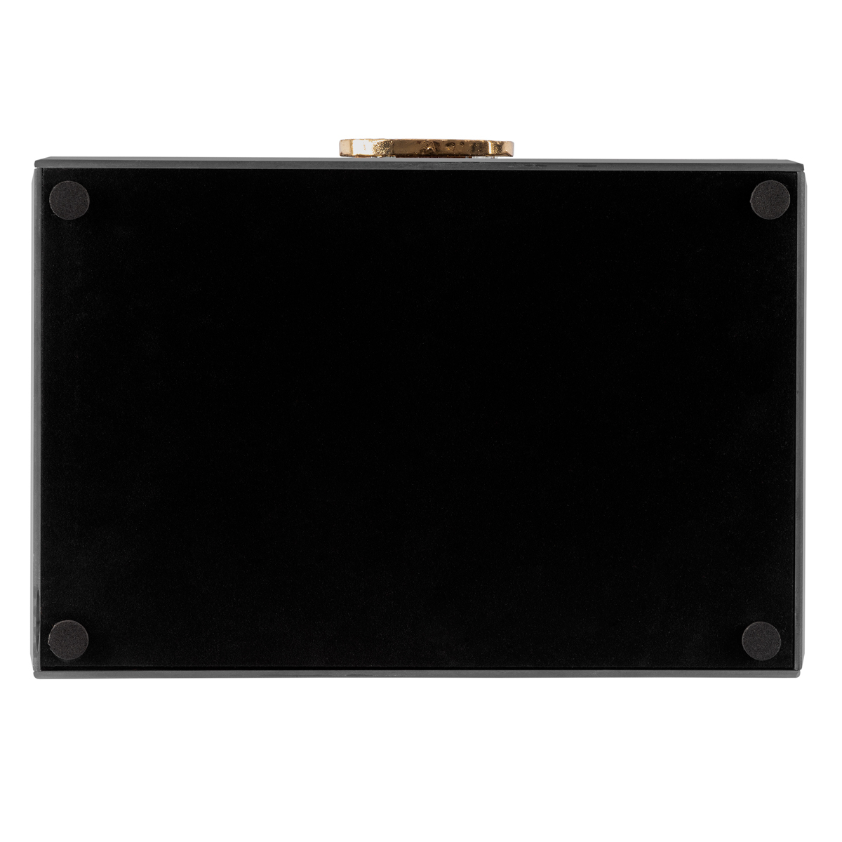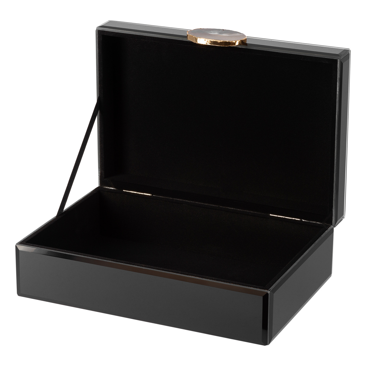 Шкатулка Gipfel Augusta 42879. Размер 24x16x8 см. Изготовлена из МДФ и стекла. Поверхность глянцевая черная стеклянная. Украшение из натурального кофейного или коричневого агата с золотой фольгированной окантовкой расположено на крышке в виде ручки. У шкатулки одно отделение с черной бархатистой внутренней отделкой. На бархатистом черном дне прикреплены мягкие ножки, не царапающие поверхность мебели.