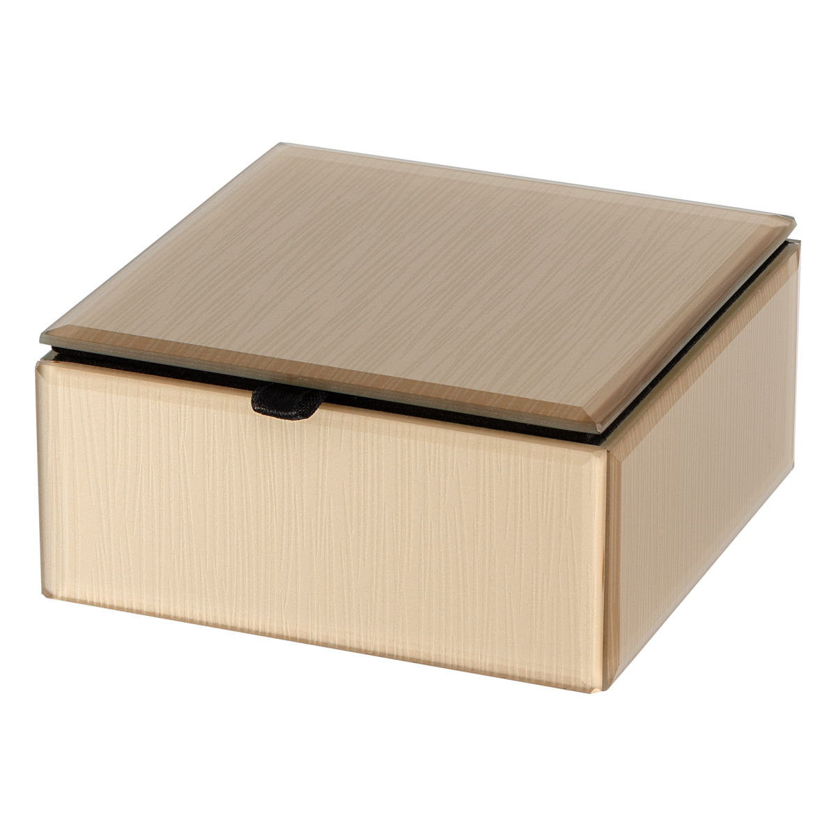 Шкатулка Gipfel Listone 42886. Размер 12x12x6 см. Изготовлена из МДФ и стекла. Поверхность стеклянная, корпус бежевого цвета с блестками.