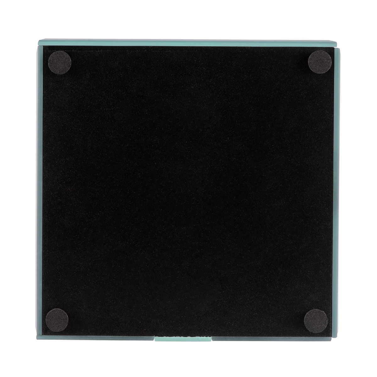 Шкатулка Gipfel Moonlight 42880. Размер 12x12x6 см. Изготовлена из МДФ и стекла. Поверхность глянцевая черная стеклянная. По центру декорирована широкой переливающейся полосой. Шкатулка с одним отделением, внутренняя отделка черного цвета бархатистая на ощупь. На черном бархатистом дне расположены миниатюрные мягкие ножки, которые не царапают поверхность мебели.