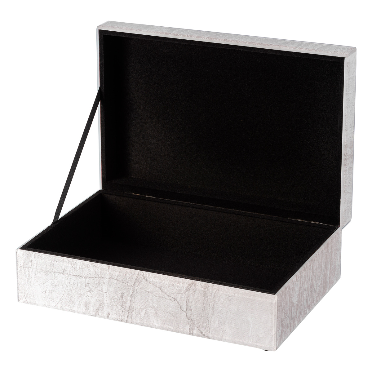 Шкатулка Gipfel Stone 42898. Размер 24x16x8 см. Изготовлена из МДФ и стекла. Поверхность глянцевая стеклянная с имитирующим мрамор принтом серого цвета в легком сиреневатом оттенке. У шкатулки одно отделение. Его внутренняя отделка, как и оформление дна, бархатистая черного цвета. На дне - мягкие миниатюрные ножки, не царапающие поверхность мебели.