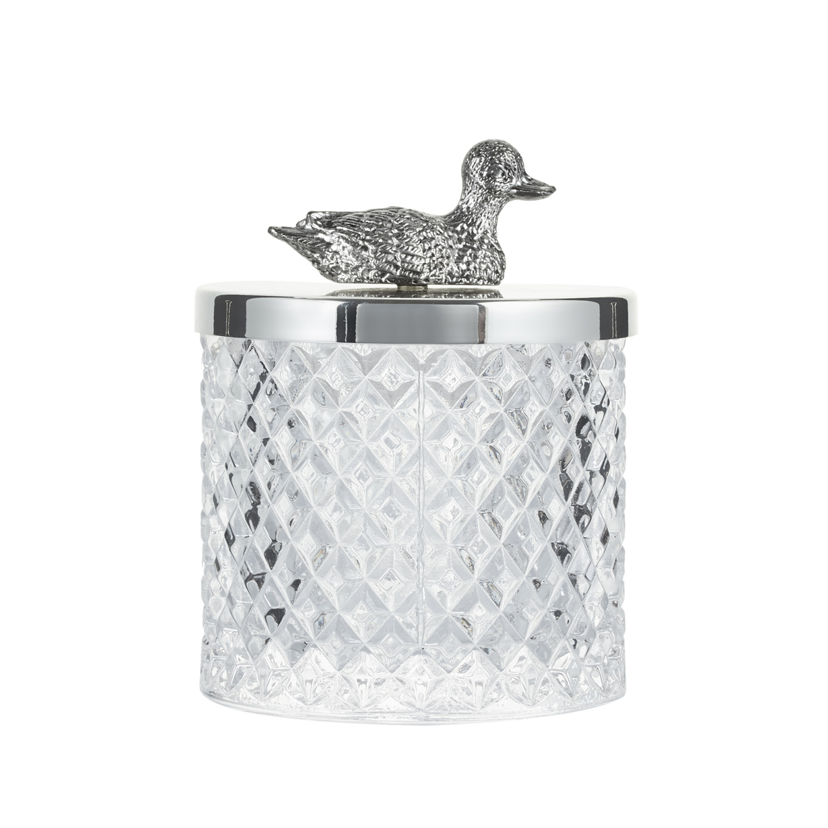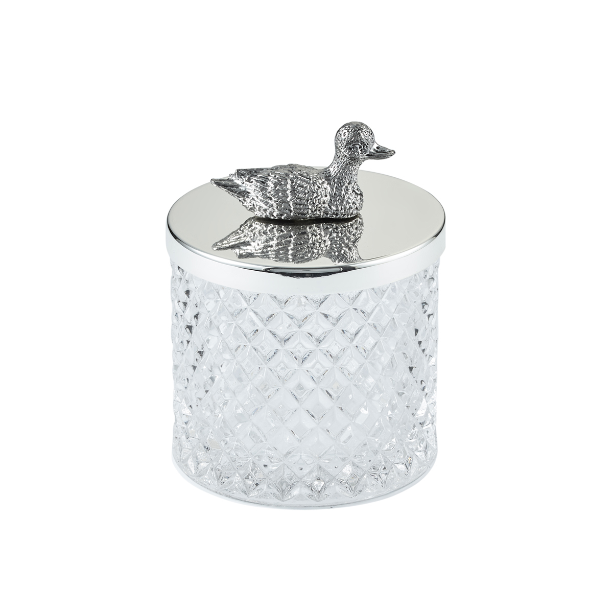 Шкатулка GIPFEL TOSCANA 41163. Размер 9,5x11,2 см. Объем 180 мл. Шкатулка сделана из толстого стекла с рельефной поверхностью в виде орнамента с ромбами. На зеркальной крышке фигурка уточки из серебристого цинкового сплава. Подойдет для бижутерии или других мелочей. Шкатулка очень красиво смотрится на туалетном столике, сверкает в лучах света всеми гранями и добавляет изюминку интерьеру.