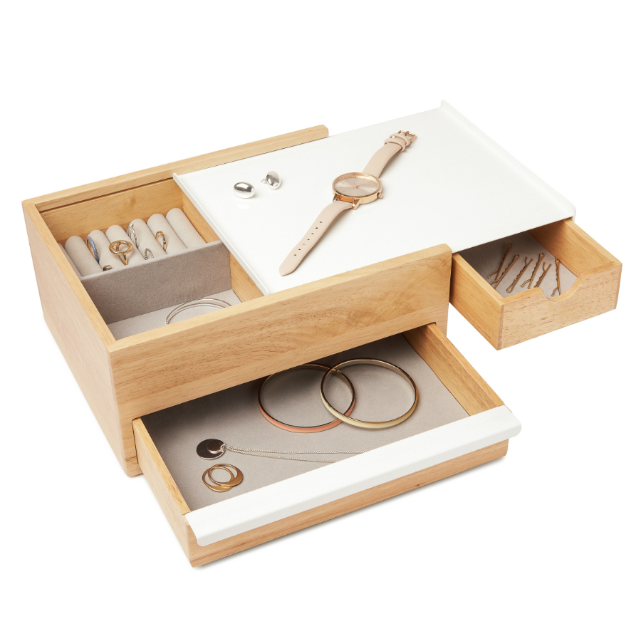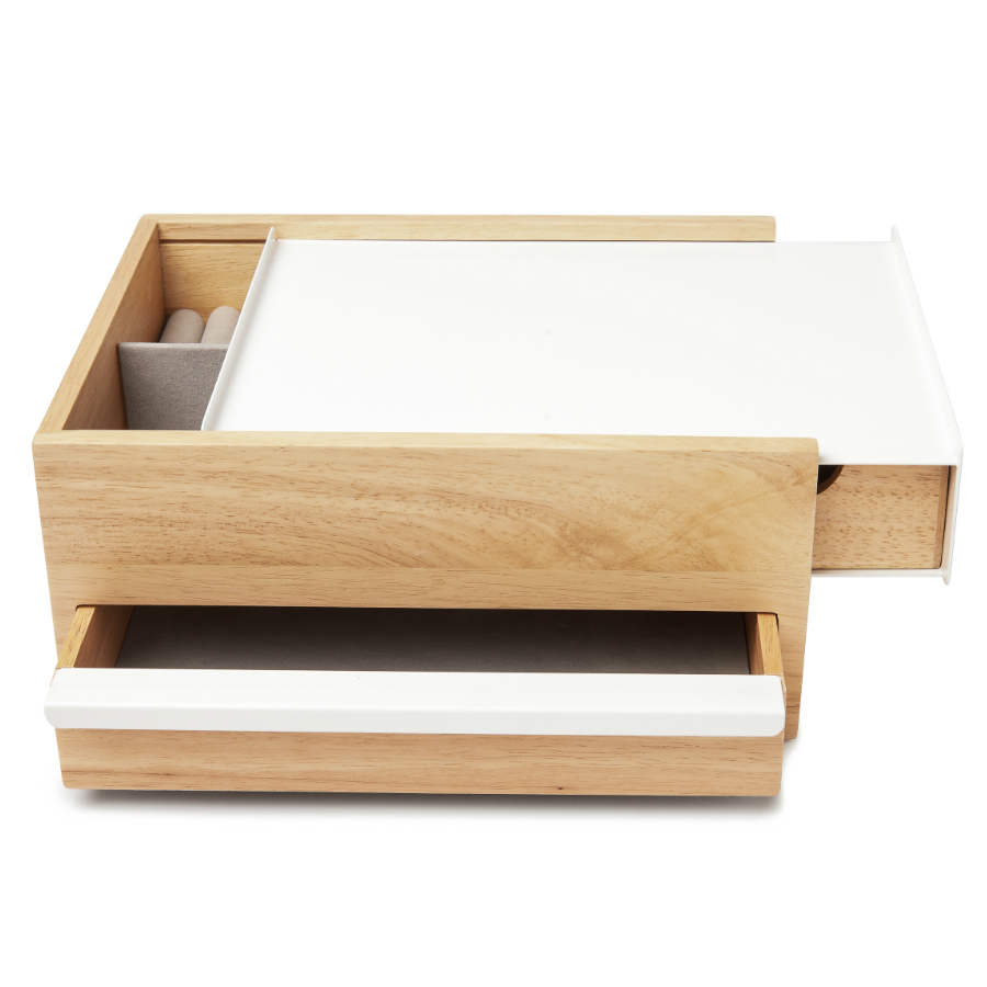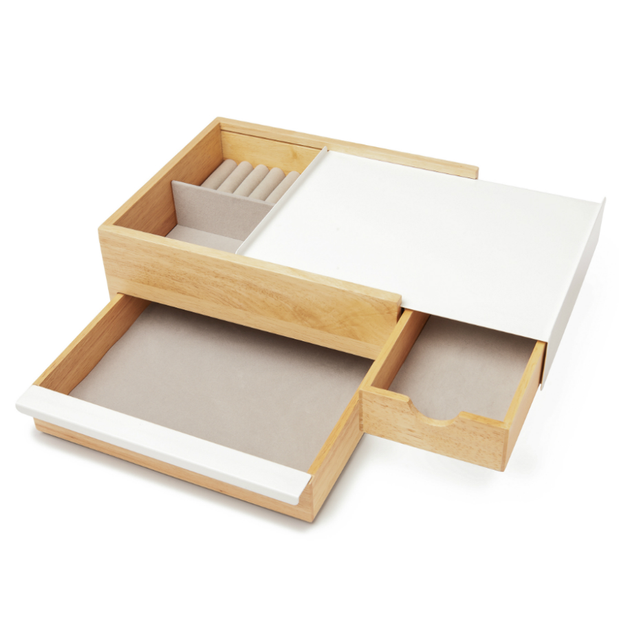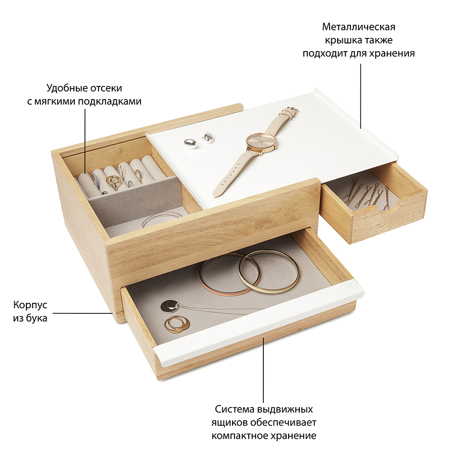Верхнее отделение оснащено кармашками для колец или запонок и небольшими ящичками для прочих мелочей. Нижняя часть предназначена для хранения более крупных аксессуаров: часов или браслетов.