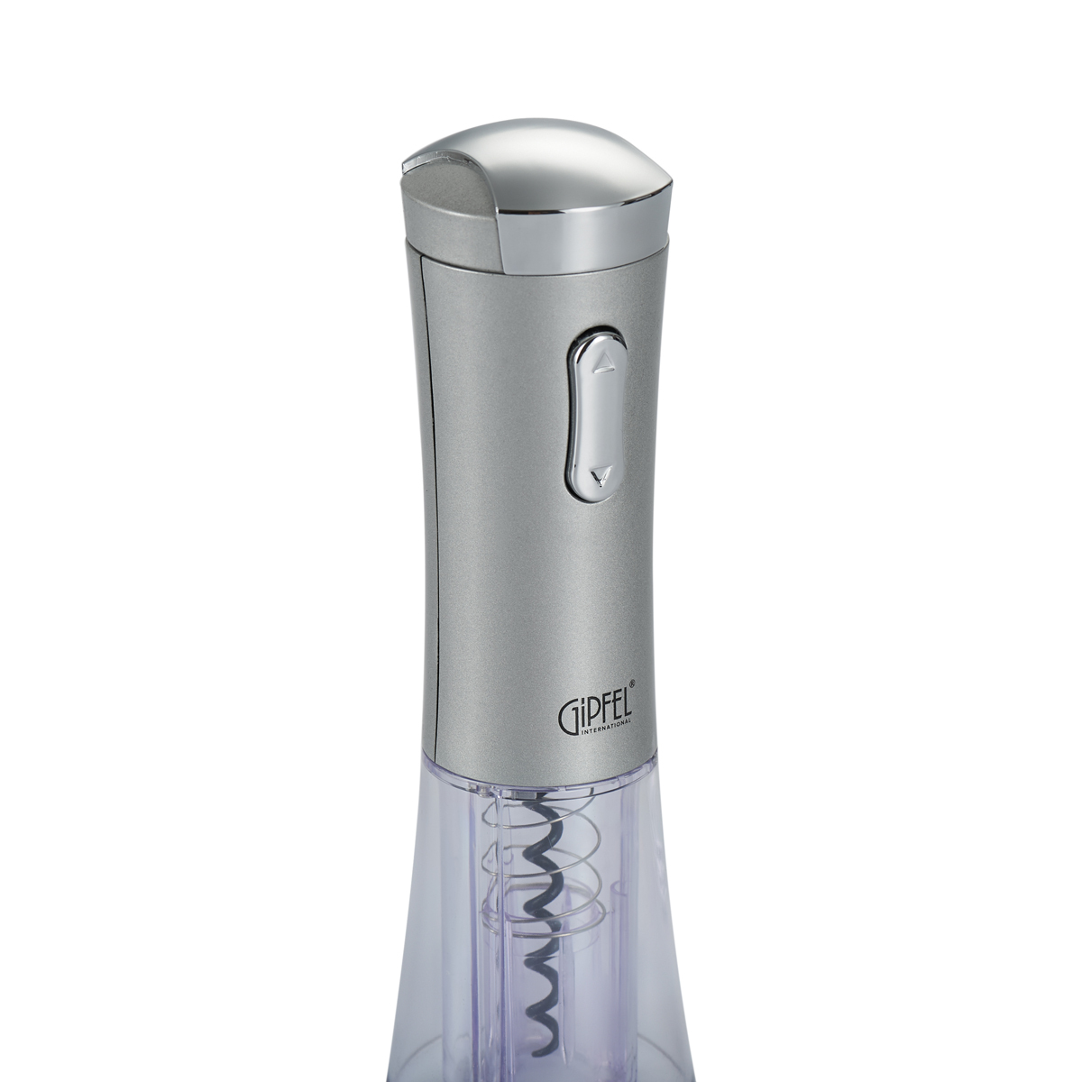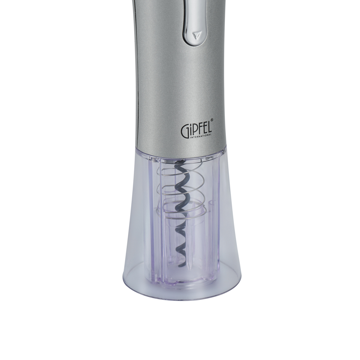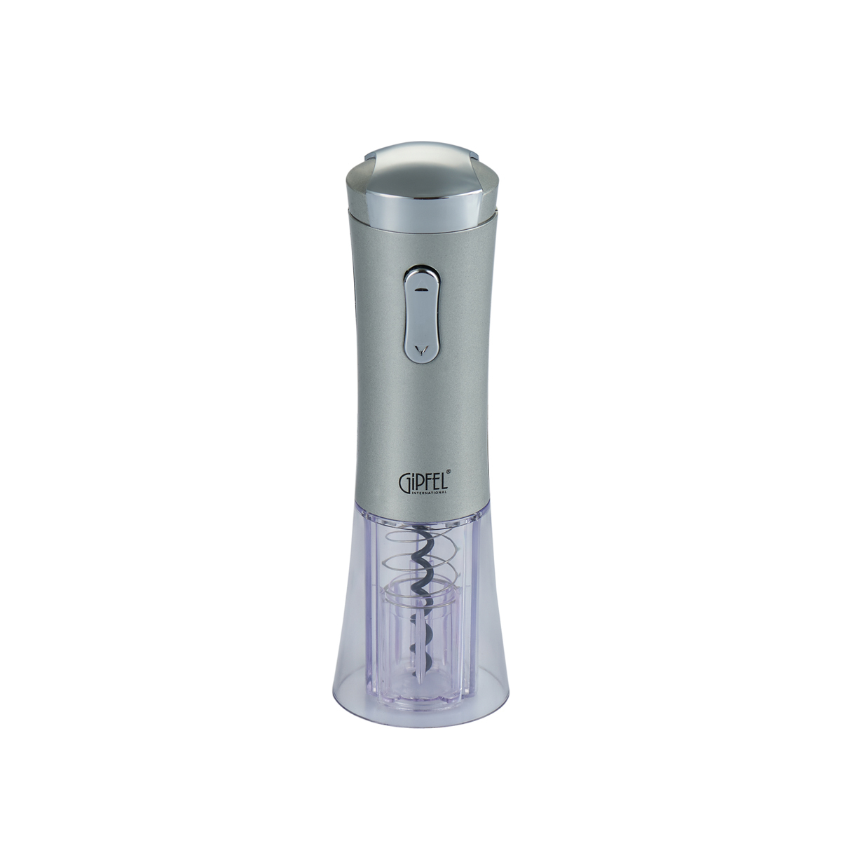 Штопор электрический Gipfel 9639 с подсветкой. Штопор имеет в комплекте шнур USB для зарядки. Два режима работы позволяют как выкрутить пробку из бутылки, так и закрутить ее обратно. При работе загорается синяя подсветка.