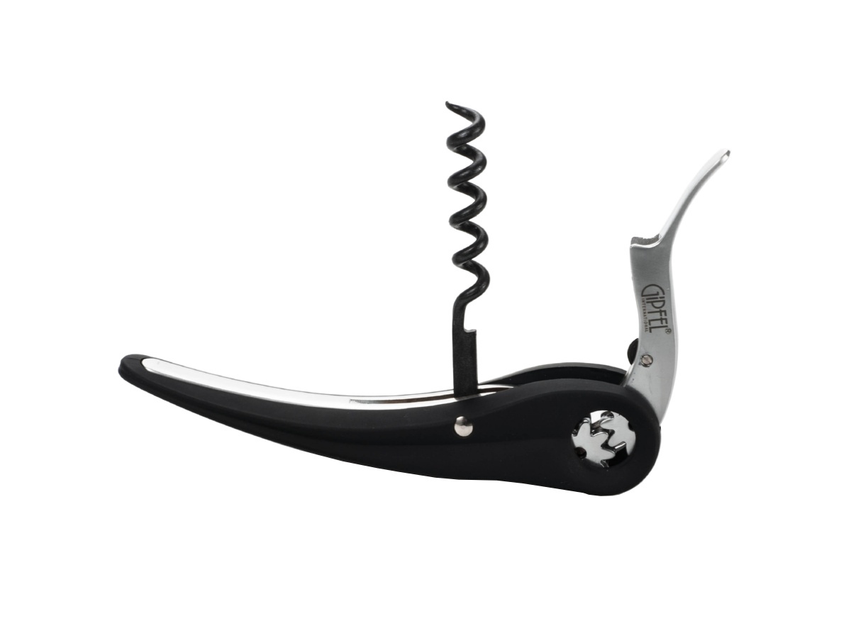 Штопор многофункциональный складной GIPFEL 9615. Размер 12,5х3,5х2,3см. Штопор дополнен открывалкой для бутылок. Сделан из цинкового сплава и прорезиненного пластика.