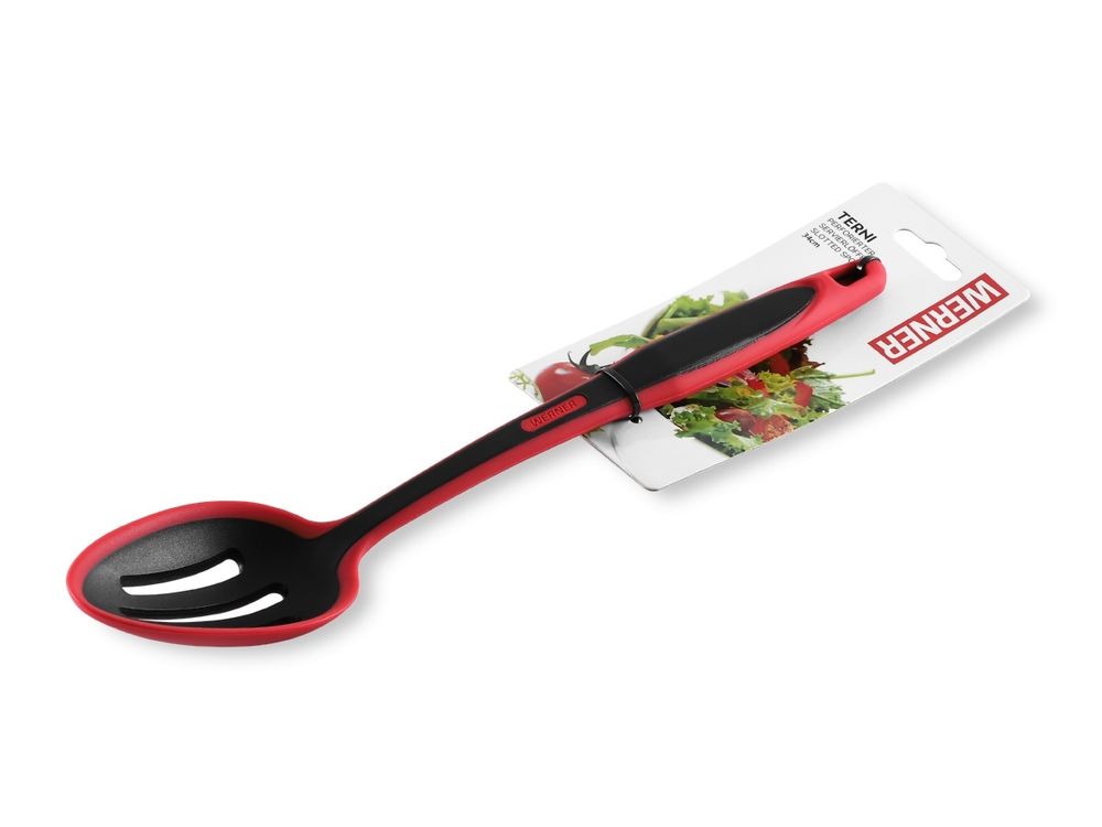 Шумовка Werner Terni 50160. Размер 34 см. Прекрасно подойдет для посуды с антипригарным покрытием. Сделана из пищевого силикона и нейлона красного и черного цветов.