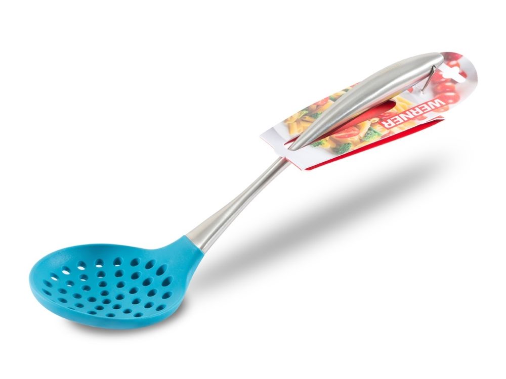 Шумовка Werner Vilano 50242. Размер шумовки 33,5 см. Прекрасно подойдет для посуды с антипригарным покрытием. Материал рабочей части: нейлон, силикон. Ручка сделана из нержавеющей стали.