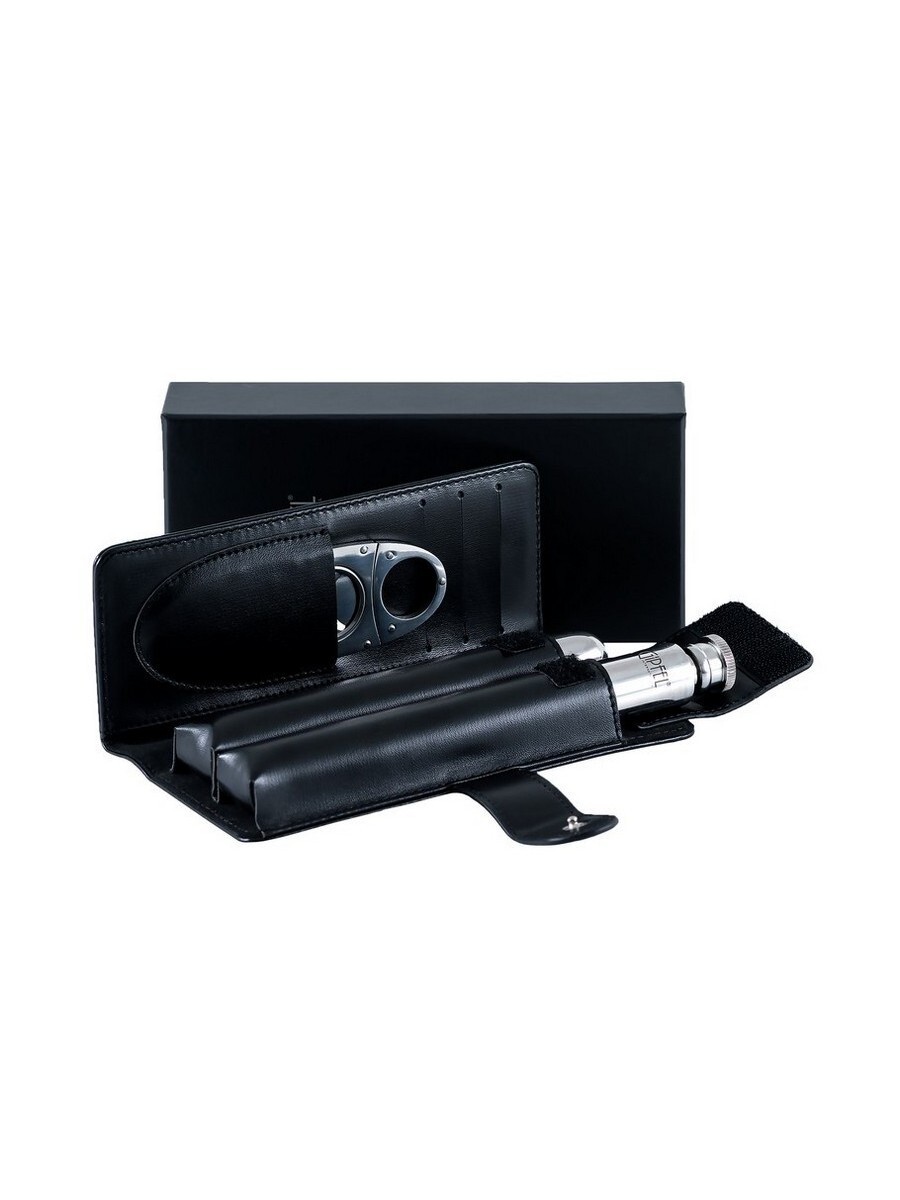 Набор подарочный GIPFEL 3763. Набор включает три предмета из нержавеющей стали: гильотину, фляжку, тубус для сигары. Предметы уложены в мягкий чехол из искусственной кожи.