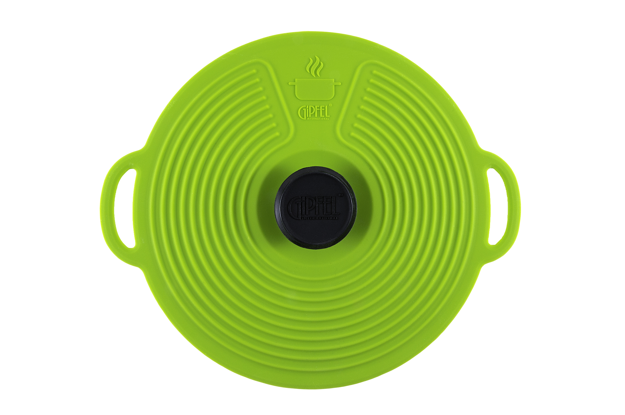 Крышка силиконовая Gipfel MAGDALINA 2633. Крышка имеет диаметр 28 см. Сделана из зеленого силикона, имеет удобные ручки по бокам и черную ручку сверху. Ширина с ручками 33 см.