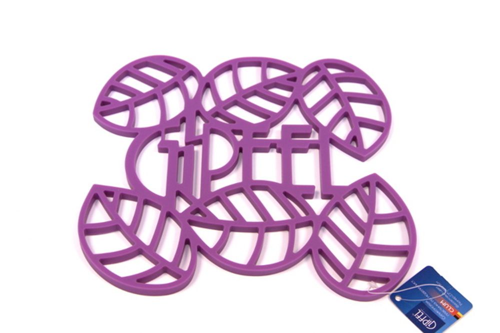 Подставка под горячее GIPFEL GLUM 0206. Размер подставки 23х20х0,8см. Подставка выполнена из фиолетового жаропрочного силикона в виде листочков, вплетенных в фирменный логотип GIPFEL.