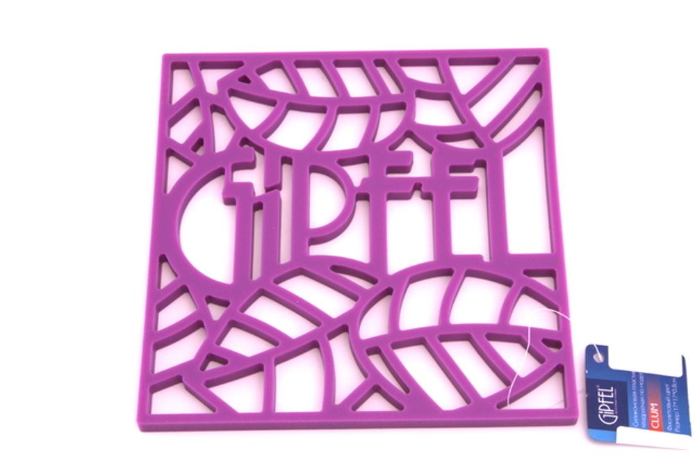 Подставка под горячее GIPFEL GLUM 0213. Размер подставки 17х17х0,8см. Подставка выполнена из фиолетового жаропрочного силикона в виде листочков, вплетенных в фирменный логотип GIPFEL.