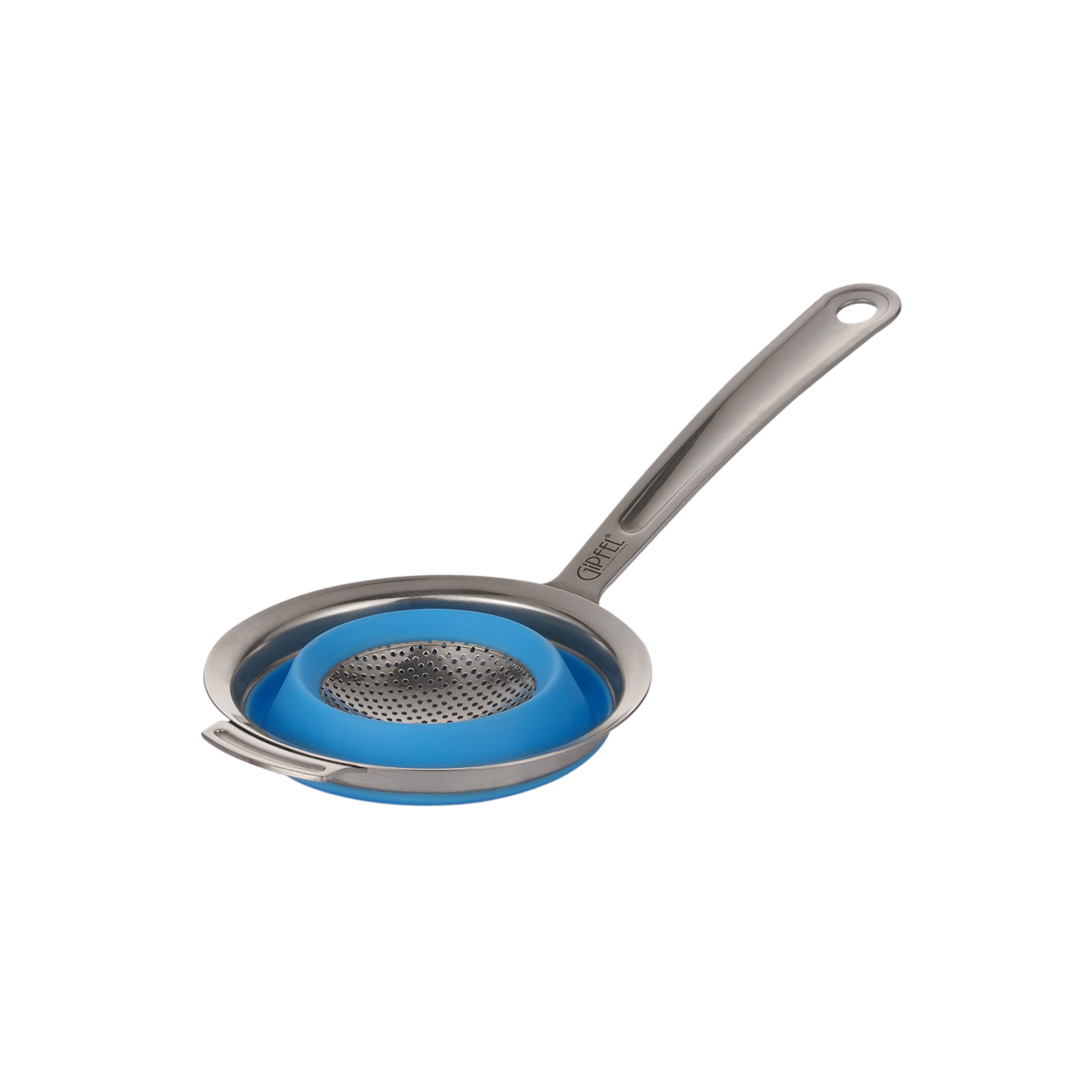 Силиконовый дуршлаг Gipfel 2607. Дуршлаг со складным силиконовым ситом диаметром 10 см. Длина с ручкой 23,5 см. Ручка и обод сделаны из нержавеющей стали. Благодаря стальному ушку дуршлаг можно поместить на кастрюлю или миску, тогда не придется держать его в руке, и можно будет свободно поместить в него продукты. Нержавеющая сталь и силикон позволяют использовать его для слива горячей воды. Силиконовая складывающаяся часть облегчает хранение.