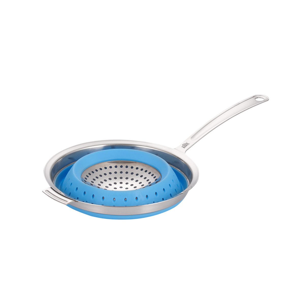 Силиконовый дуршлаг Stahlberg 2609-S. Дуршлаг со складным силиконовым ситом диаметром 20 см. Длина с ручкой 38 см. Ручка и обод сделаны из нержавеющей стали. Благодаря стальному ушку дуршлаг можно поместить на кастрюлю или миску, тогда не придется держать его в руке, и можно будет свободно поместить в него продукты. Нержавеющая сталь и силикон позволяют использовать его для слива горячей воды. Силиконовая складывающаяся часть облегчает хранение.