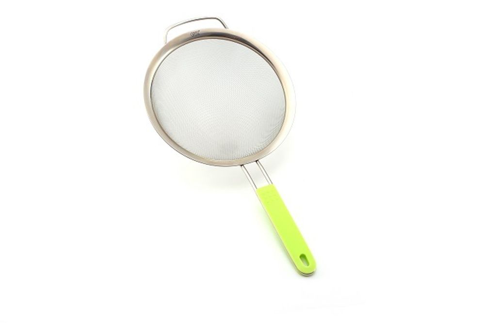 Сито из нержавеющей стали Gipfel 5477. Диаметр сита 14 см. Ручка сделана из силикона. С противоположной ручке стороны имеется стальной упор, чтобы удобно было класть сито на кружку или банку.