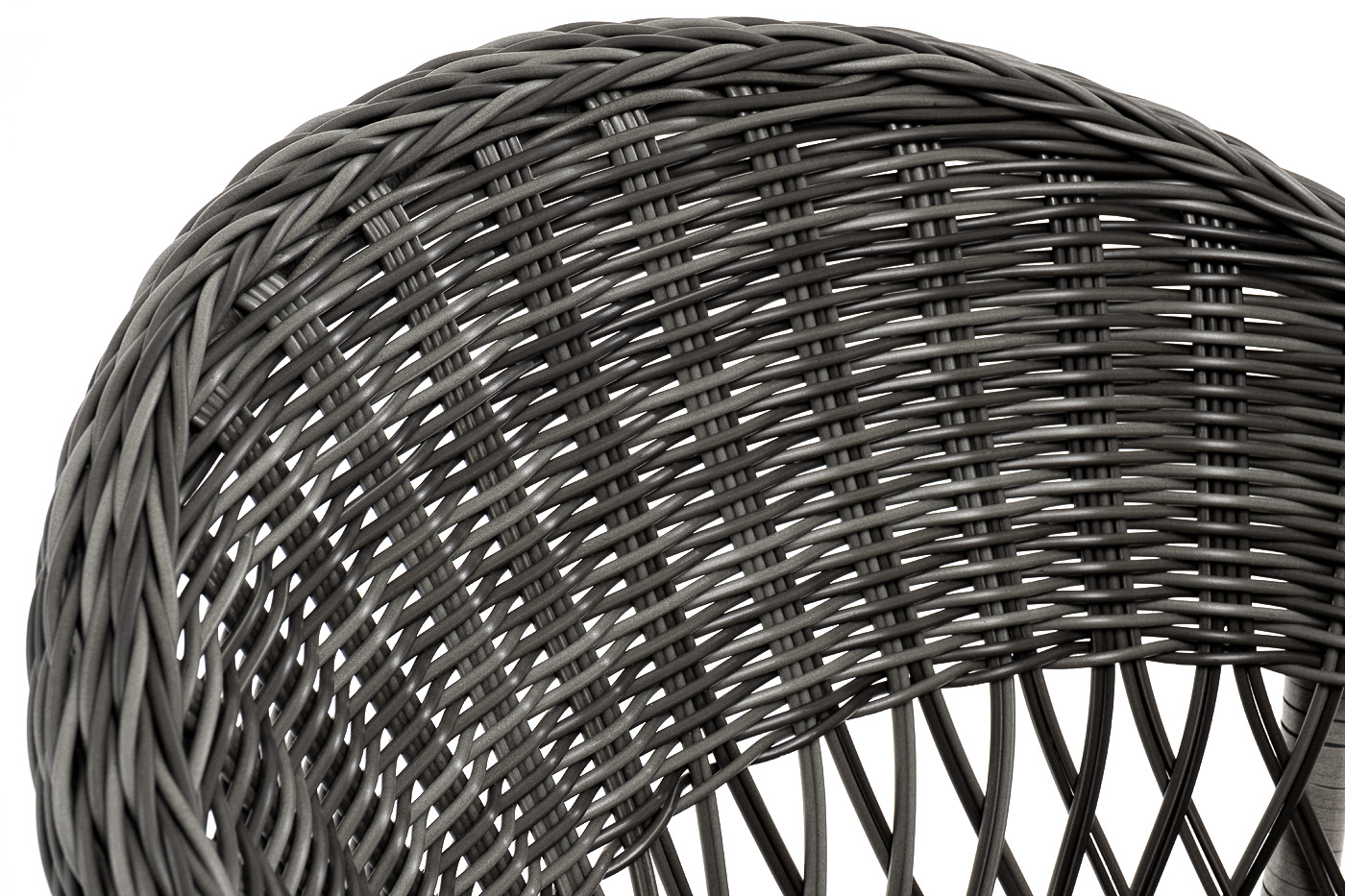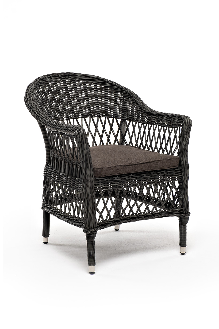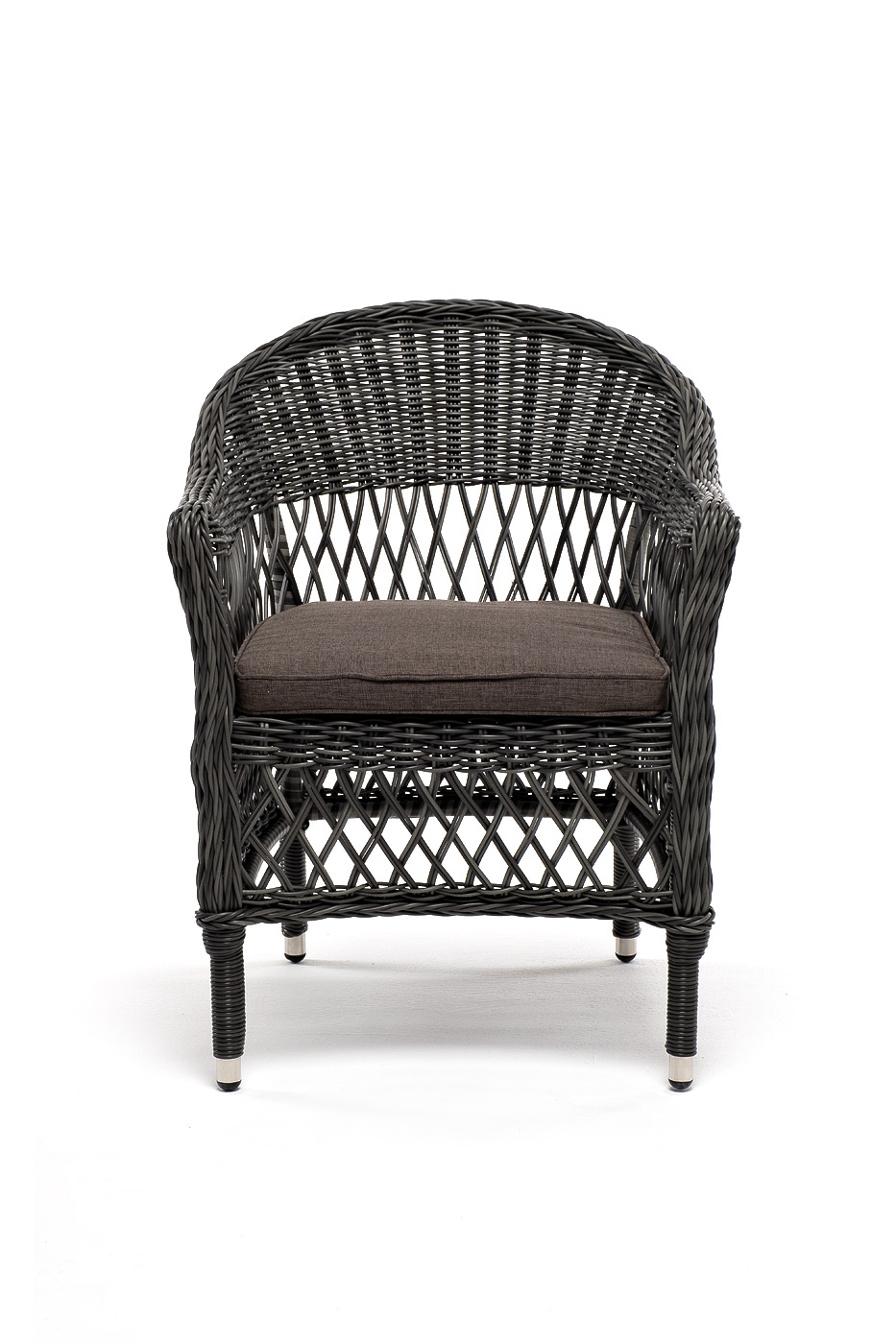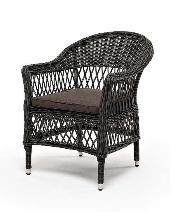 Стул оплетен вручную круглым искусственным ротангом графитового оттенка. В комплекте представлена мягкая подушка-сиденье серого цвета. Подушка имеет съёмный чехол из полиэстера (100%), плотностью 300гр/м2, с влагоотталкивающей пропиткой.